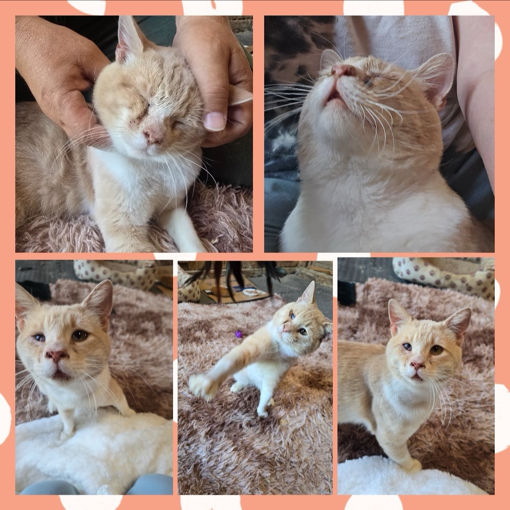 Benji has been put through the wringer. He lost his mom, his home, and was completely abandoned. He is still the most loving kitty I have ever had in my care. Before he eats, he wants love, and a lap to cuddle on. He is very playful and has a fantastic personality. He deserves a chance at a pain free life with a family who loves him. I'm desperately trying to get him healthy enough to get him adopted.