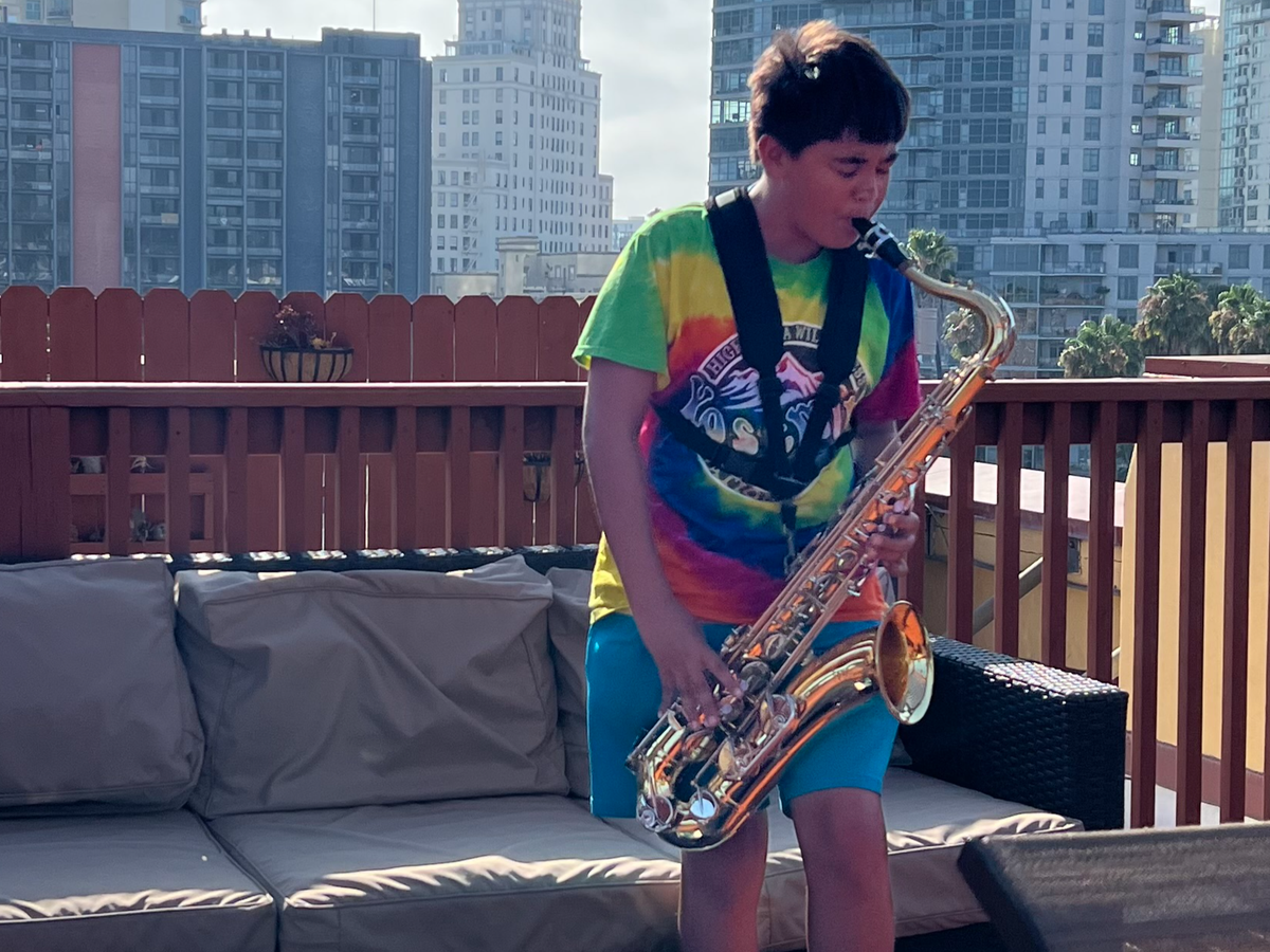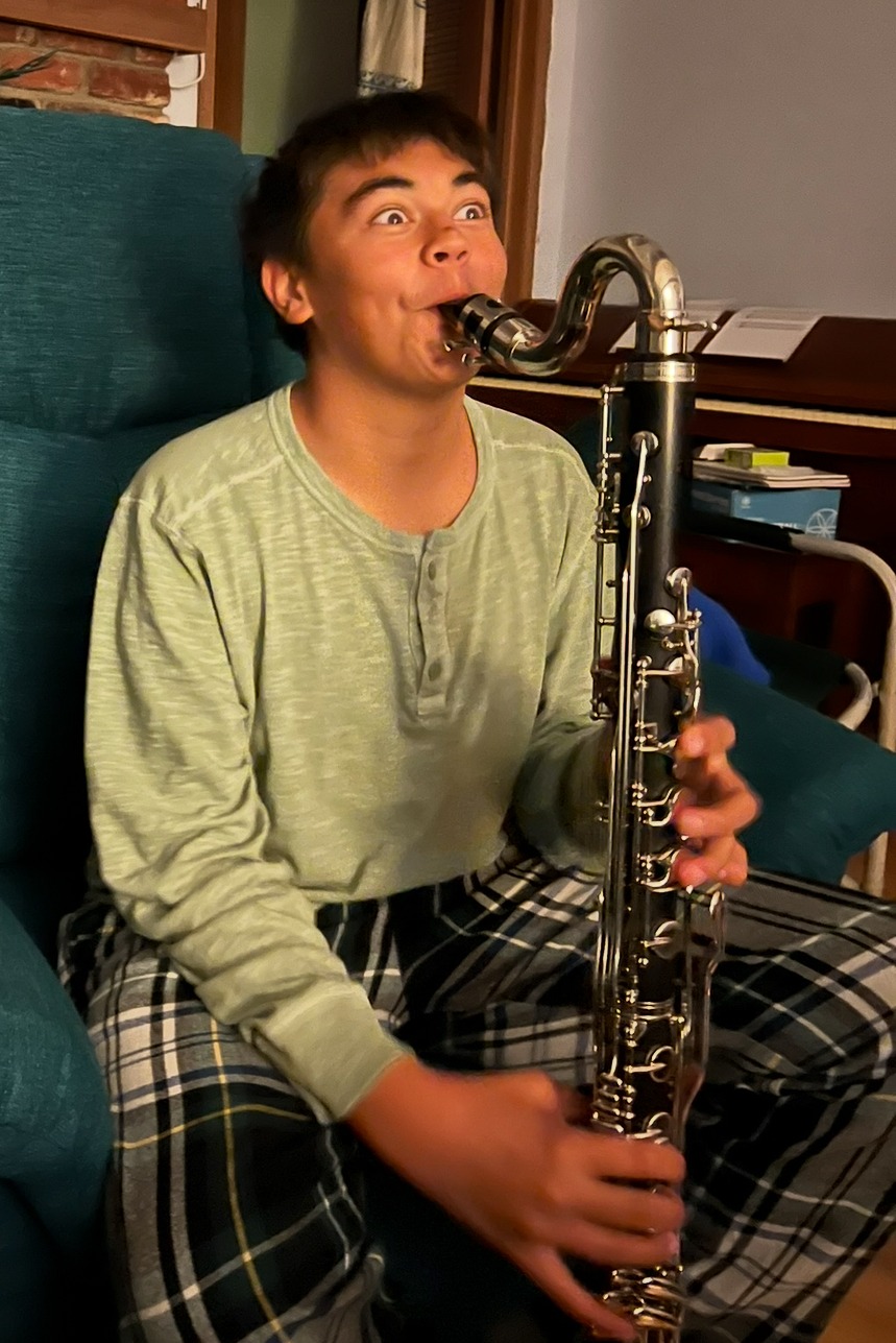 Additionally, Teddy's private instructor has suggested it is time for him to pick up yet another instrument. What do I mean by "yet another instrument," you ask? Well, he began by playing his grandmother's piano in first grade until he was gifted a keyboard in fifth grade; since then, he has picked up alto, tenor, and bari saxophones, with tenor sax as his main instrument; clarinet and bass clarinet; slide trombone; a variety of recorders; an ocarina (from the Legend of Zelda video game); a penny whistle; my great-grandmother's violin; my great-grandfather's classical guitar; and a ukulele.