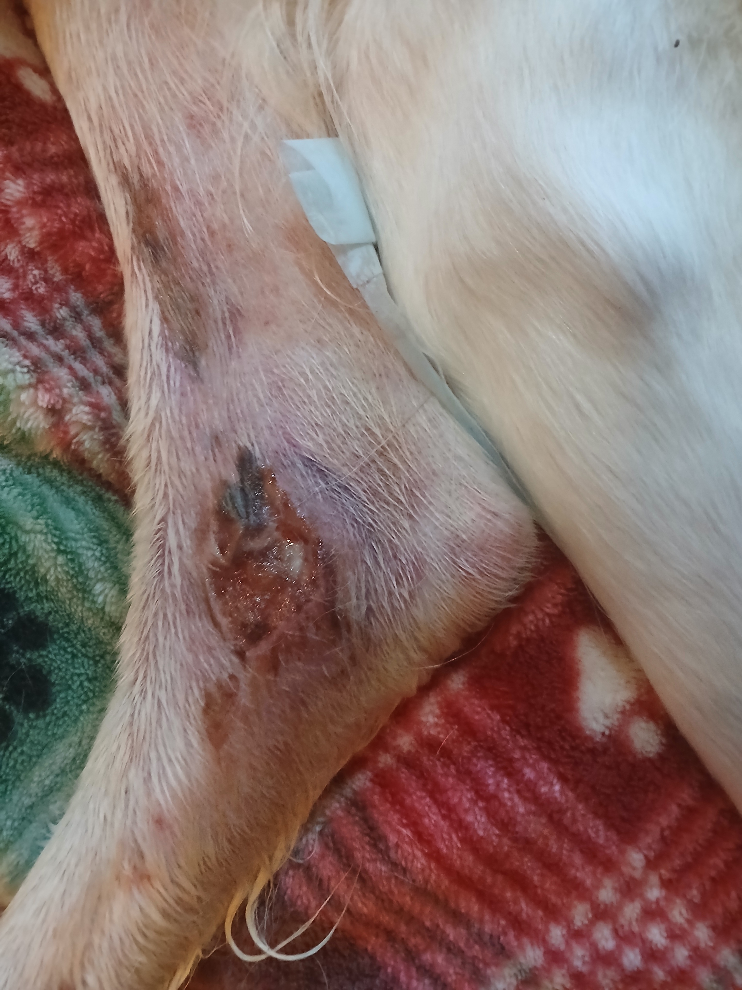 It was being kept clean with antibiotics and as I planned on spending new years with friends in New York, I figured that the vet she boards at would be able to give her wound care during her stay.