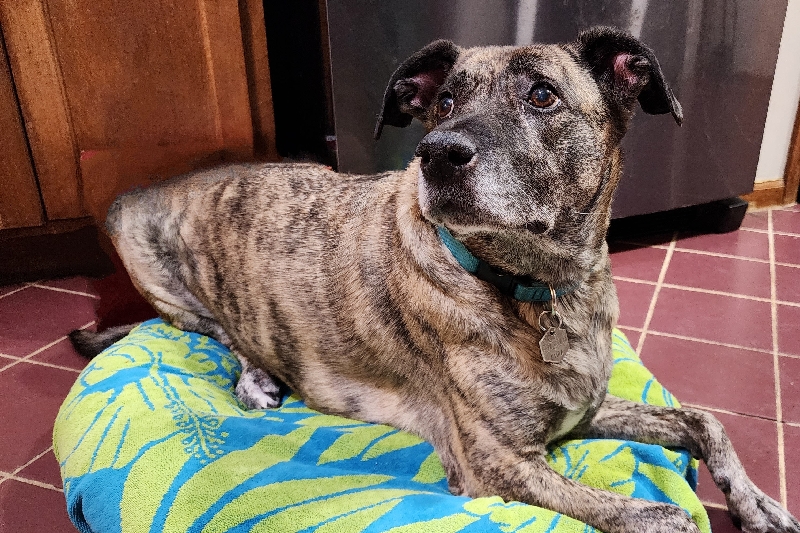 Kora arrived at our house, a few weeks before my mother-in-law suffered a stroke and passed away. Kora was found at a flea market in a cardboard box that said, "World's Ugliest Dog". She was saved by a friend of mine who then asked if I could help Kora find a forever home. Kora was supposed to be a foster. However, when my youngest was crying inconsolably over the news of his Grandmother's passing, we found Kora, curled up around his head and licking his face to calm him down.