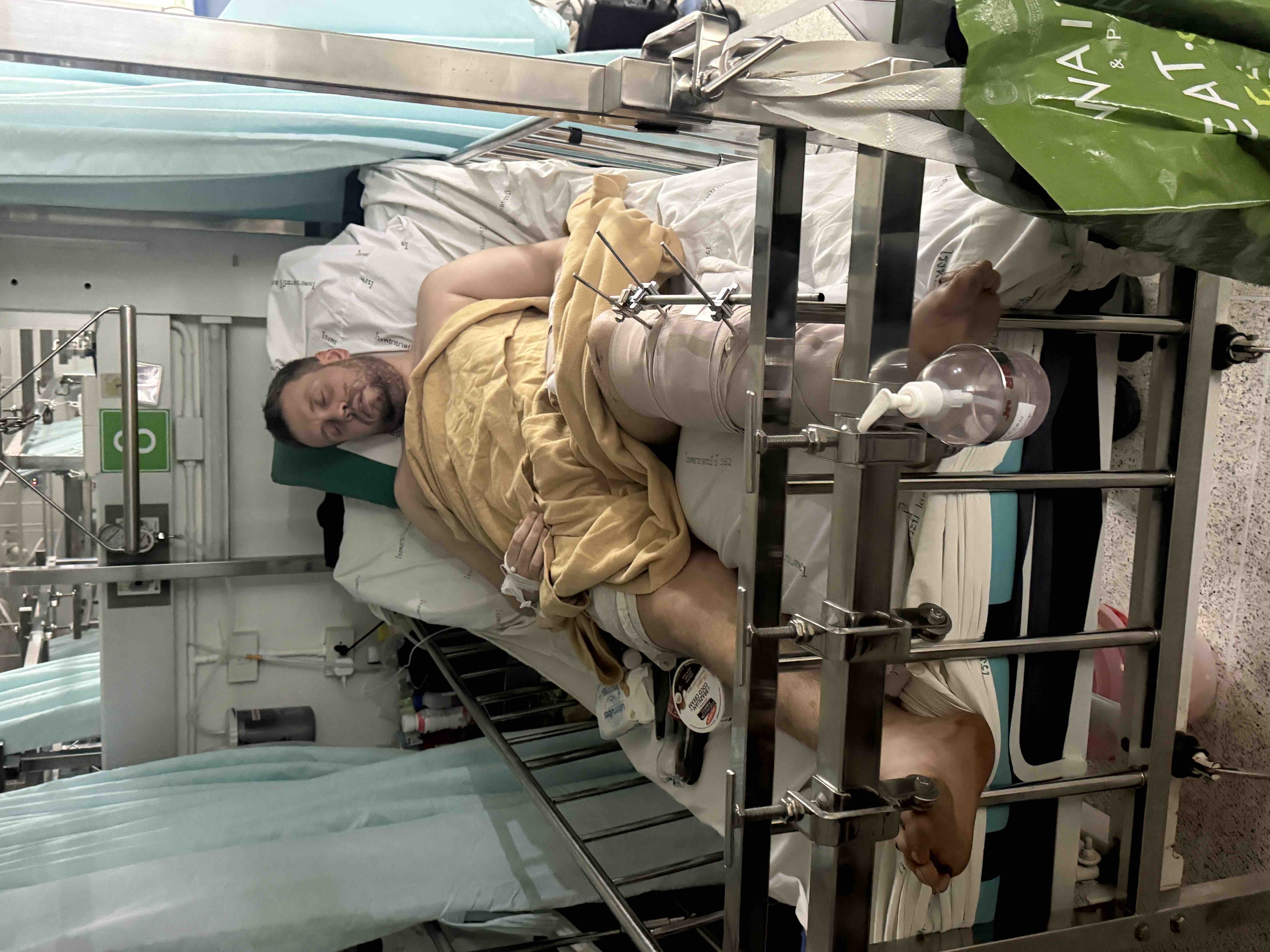 He currently has an external fixator holding his leg together. He is in pain, and thousands of miles from home.