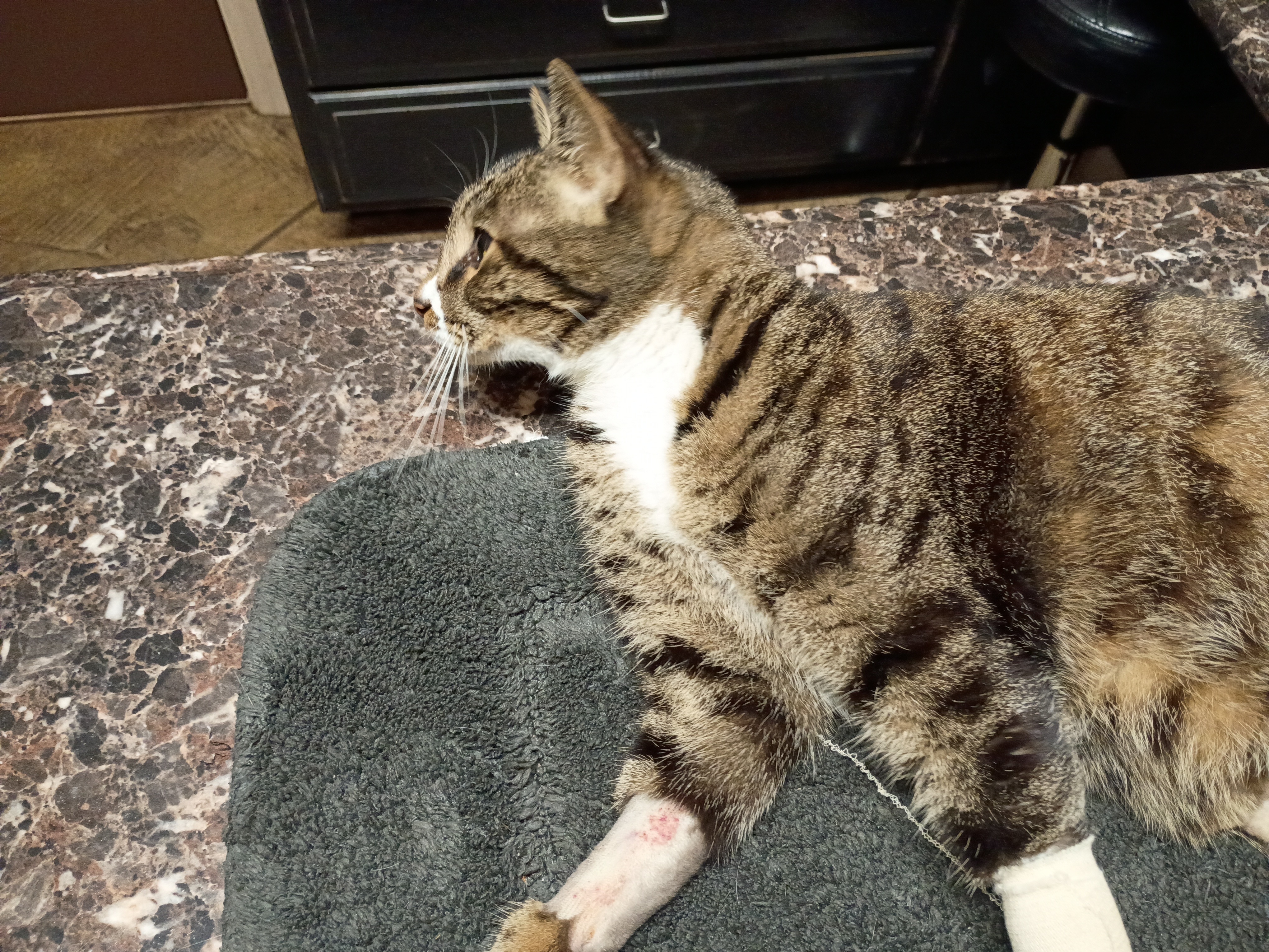 I'm hoping that the kindness of strangers will allow me to keep my favorite little buddy alive. His name is Biscuit. Also "Mr. Biscuit.", or "Mr. Bubba, sir.". He's only 2 years old, and just last week had to be rushed to the vet with a sudden onset of an infection so severe, that by the time he got to the vet, he was at 27% kidney function. One more day and he'd have died. The decline was *head-spinningly* fast. Fast forward to today, and he has received blood transfusions, and is on a special prescription kidney diet. He is also on a treatment of antibiotics and medications to stimulate red blood cell production, as he was also rendered anemic by this infection, and they still haven't completely ruled out cancer. We still don't know where the infection came from, but have ruled out environmental hazards, as Biscuit has 3 sisters, and they are all in good health.