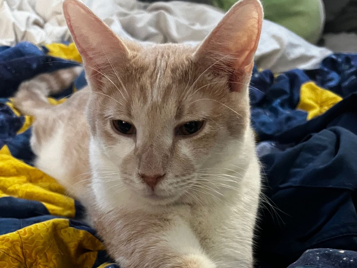He was brought to the shelter I work at at 2 months old, with a dog attack wound. We treated it, and he developed eye issues, and respiratory issues. Treatment didn't stick, but he was still acting normal, so we kept an eye on him. He developed ringworm, and in that time I fell so hard for him. He is cuddly, loves to play, loves attention, and is absolutely the best cat ever.