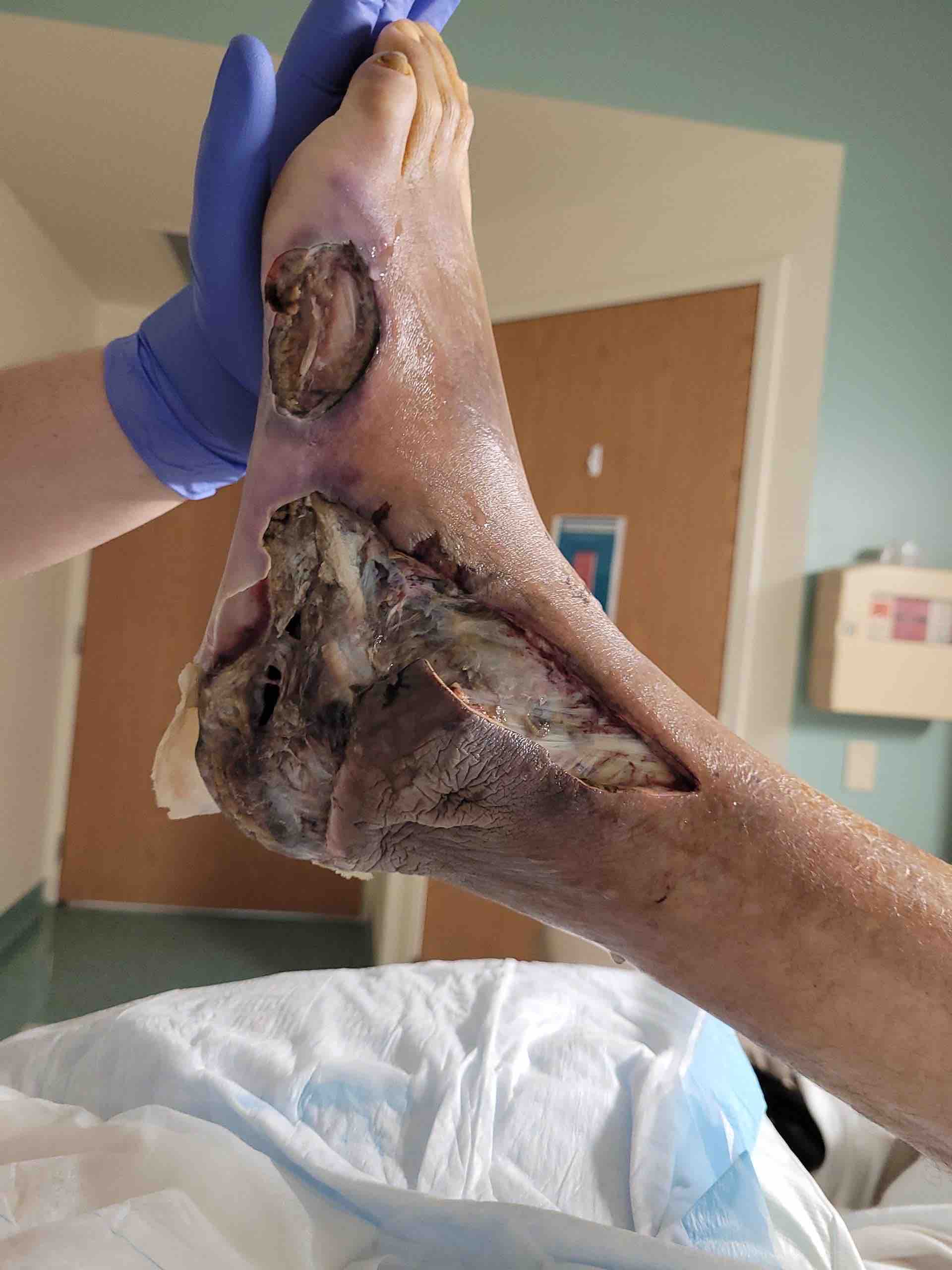 Unfortunately, 2 weeks ago Michael had a small cut on his foot that has since gotten very severe! That small cut became infected and turned into necrotizing Fasciitis! The infection spread heavily through his foot! Below is the aftermath of his foot