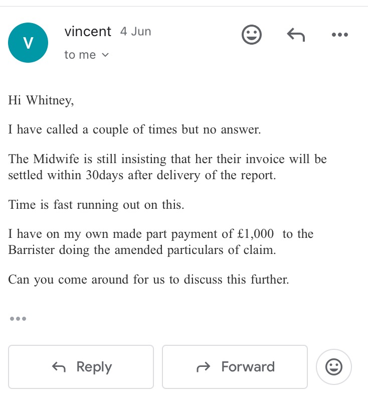 As I dove further into this, in April, the defendant then applied for a “stay” based on me needing to produce a medico-legal expert’s report stating where the negligence took place, and gave me 2months to do so. That expert is another midwife of an independent firm. They also said I was to write my particulars of claim based on CPR Rules, which was agreed by the judge. Something which I just couldn’t do, as I was essentially writing a witness statement.