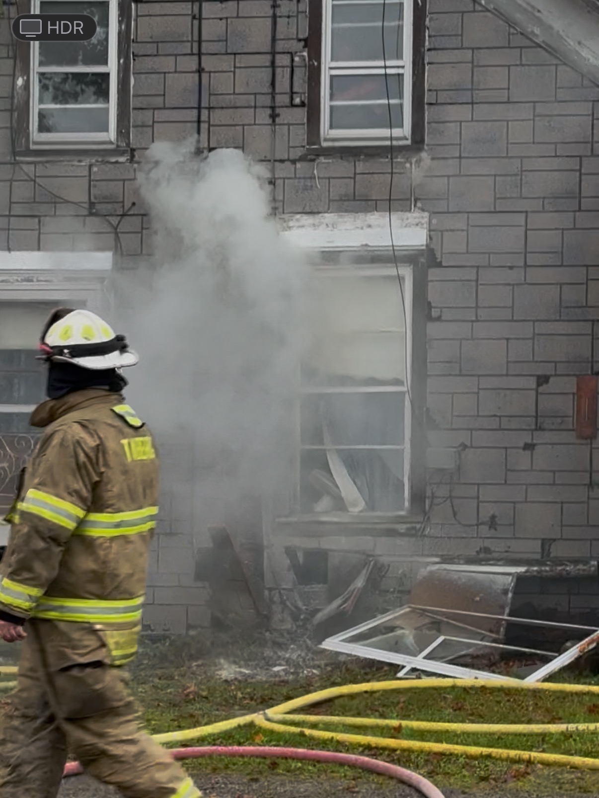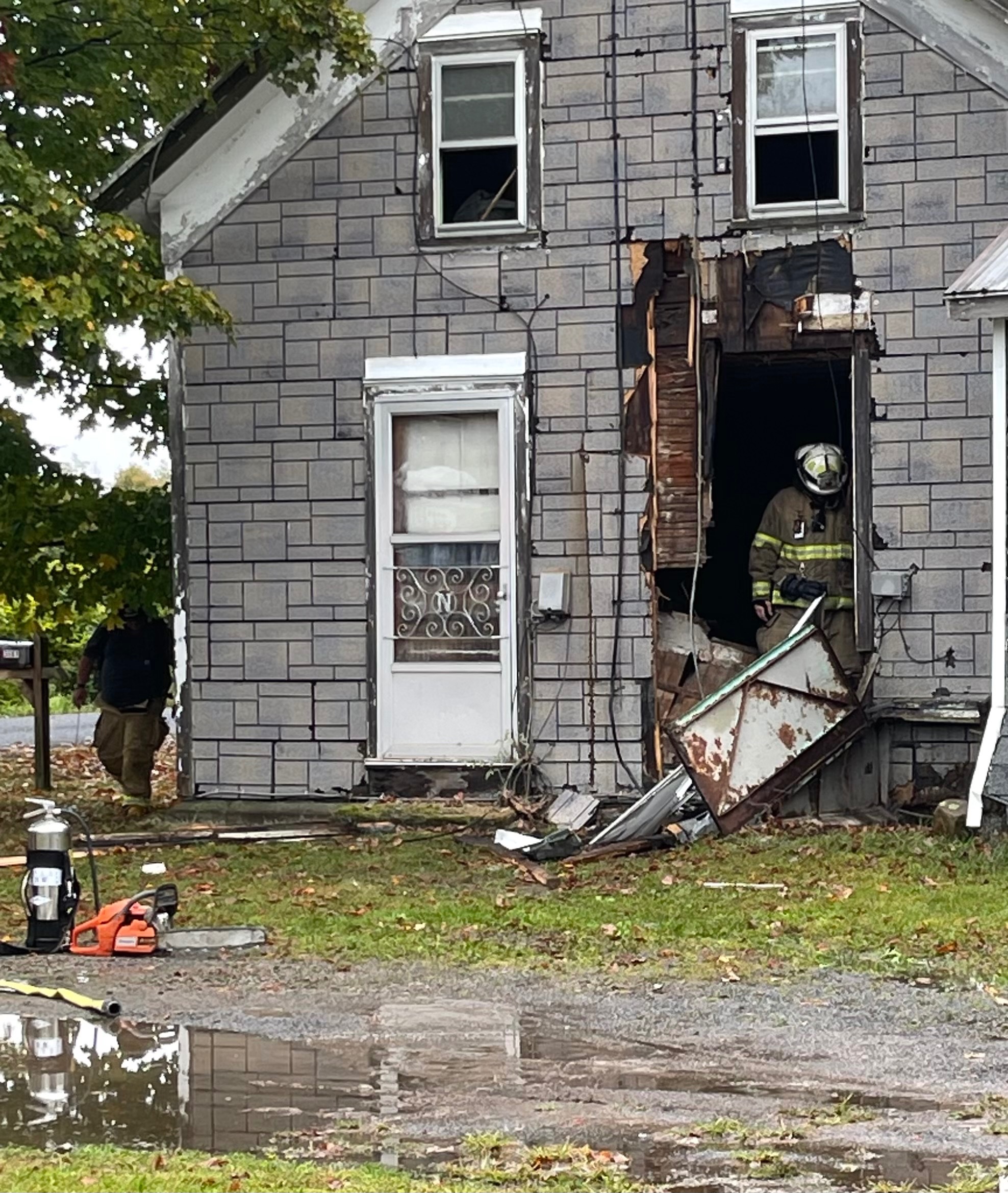 They called 911 and tried two different fire extinguishers while waiting for help, but the flames kept coming back. My uncle next door rushed over with buckets of water, and a police officer was first on the scene and tried to help. The fire continued to reflare and spread inside the walls.
