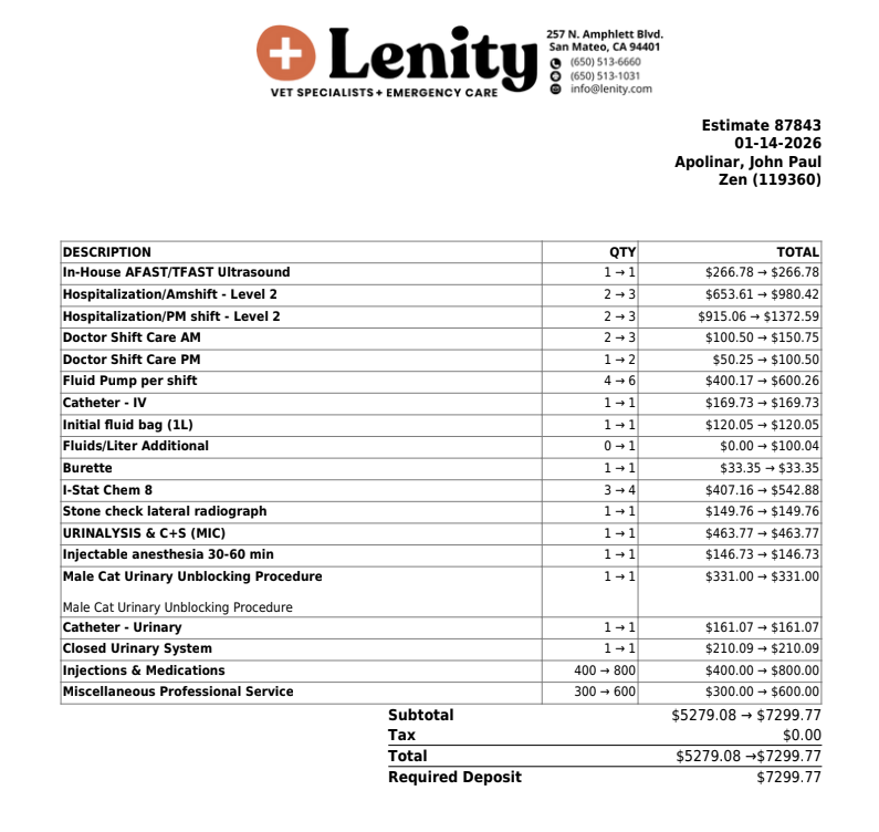My name is Jay, and this is one of two of my sibling pair of cats, Zen. On 1/15/2026, Zen suffered from a urinary blockage, a very serious and life-threatening condition where he could not use the bathroom. During this blockage, which lasted about a day and a half, he was unable to eat or drink and slowly became lethargic until he was no longer able to stand as he was extremely weak. His treatment required hospitalization, various fluids, and constant monitoring in order to restore him to a decent condition. Unfortunately, I did not have pet insurance at the time of the incident and had to bear the cost of the entire operation, which, including vet fees, totaled to about $8000.