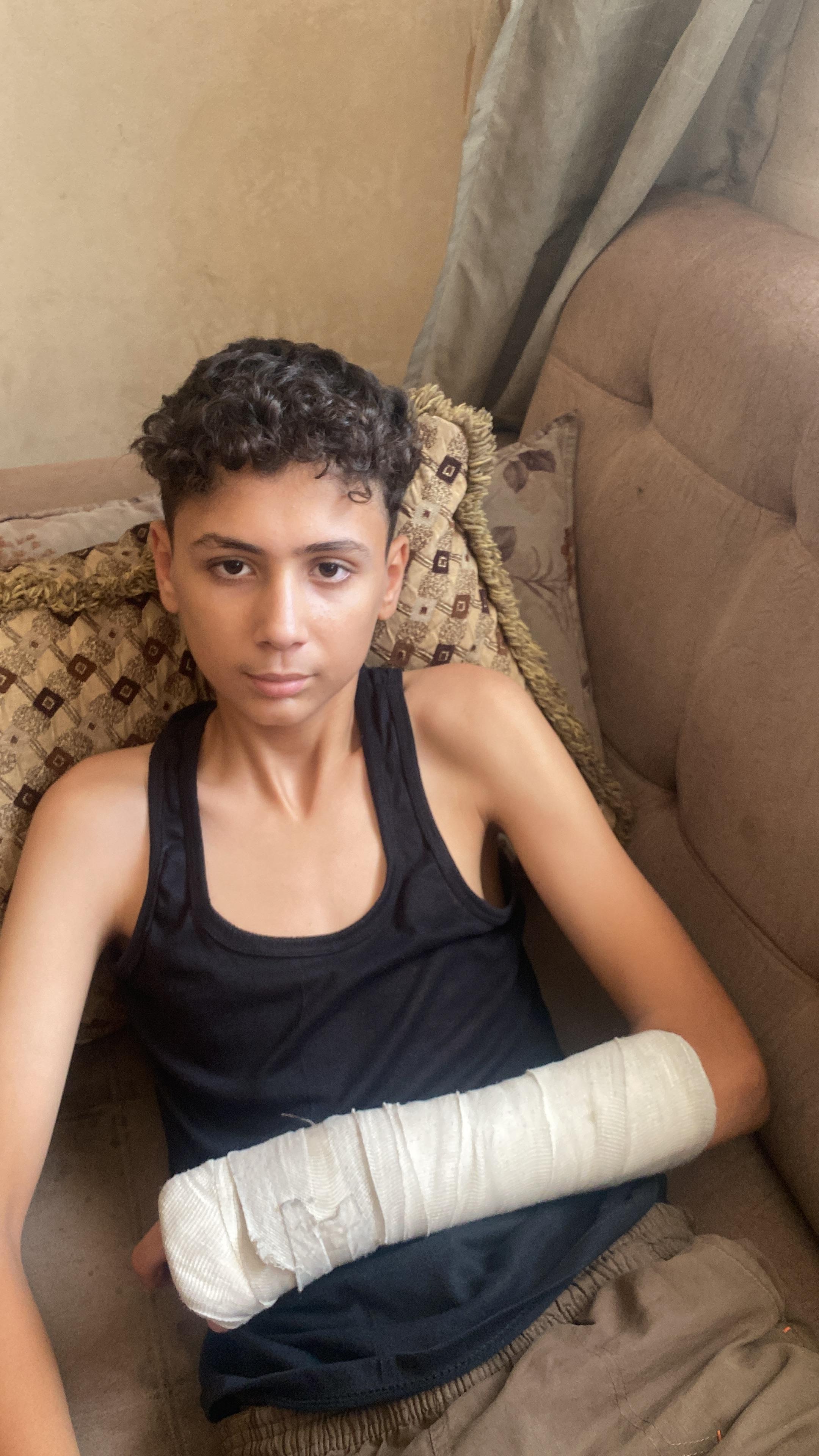 Her 14 years old son Adnan was injured. His hand was injured by a quadcopter planeI.He has a bone-frugmented and needs surgery in his hand and the installation of a platinum, but because of the lack of possibilities in hospitals, there is no treatment for it.