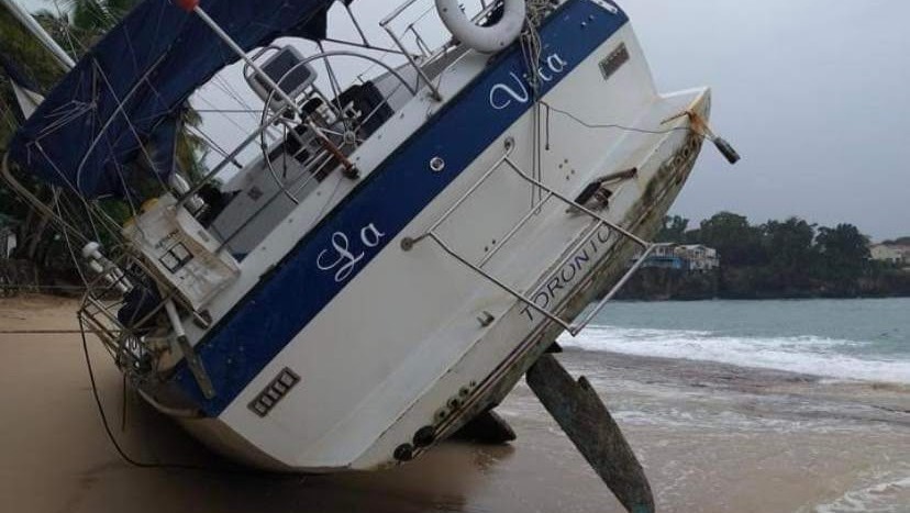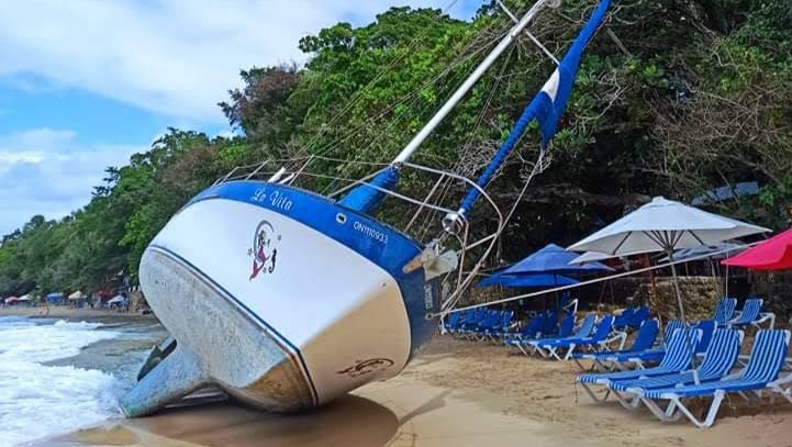 The boat was moored at Sosua Bay, Dominican Republic until about two weeks ago, heavy wind and rain broke the buoy, and the boat drifted and landed on the shore of Sosua Beach. It lay there while we tried coming up with a plan to move it back to the sea, and finally, with the help of the amazing local community, we were able to get her floating again.