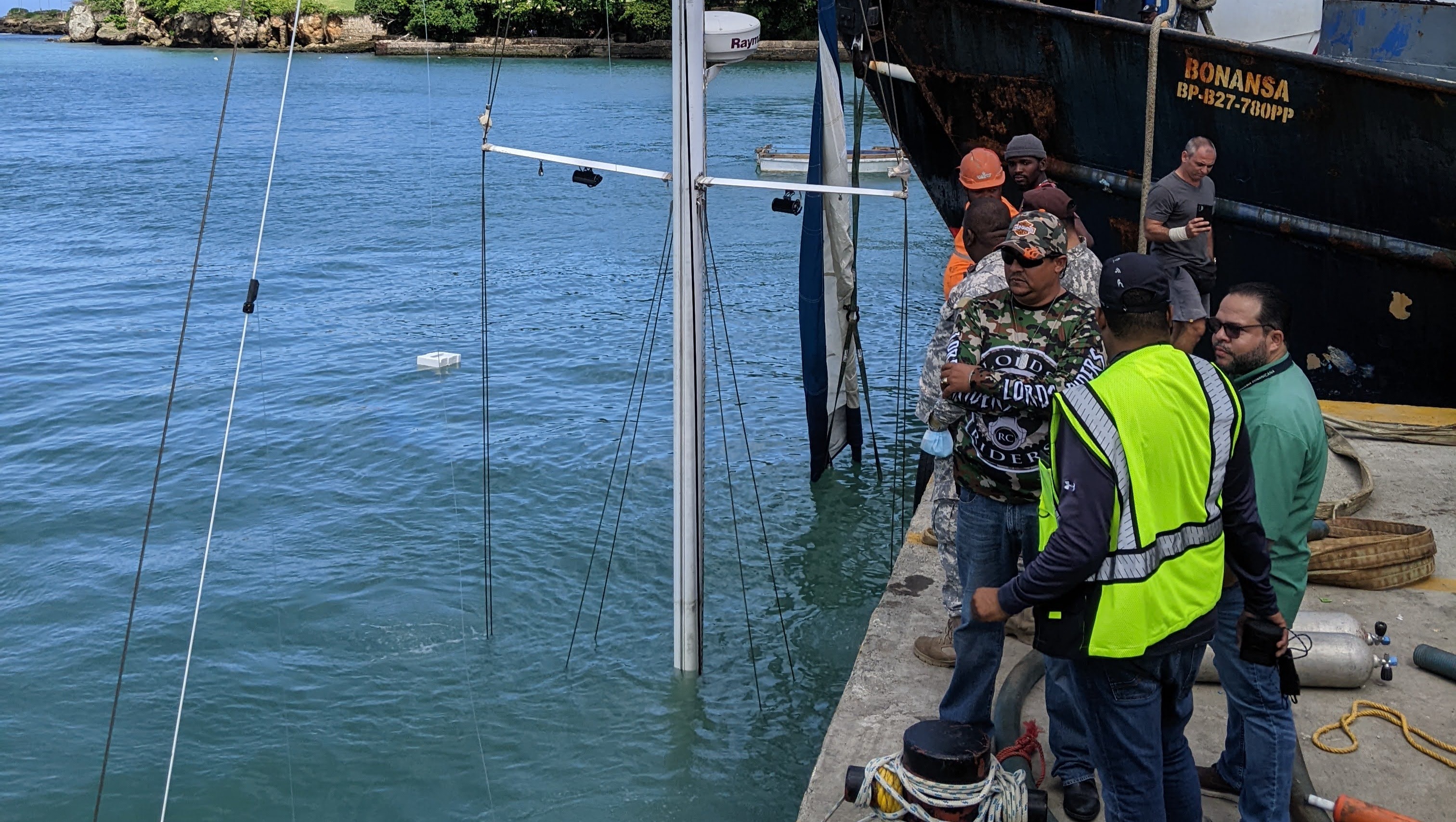However, due to the prolonged time of the boat being on its side, and the way it was pushed back in to sea, the fiberglass had sustained some damage, and the boat started filling with water. We borrowed a powerful water pump, and our plan was to pull the boat to the closest marina, which had a lift, so we could fix the damages under the boat’s waterline. Unfortunately, the boat did not make it a mere 2 miles to the marina and sank at the commercial port of Puerto Plata.