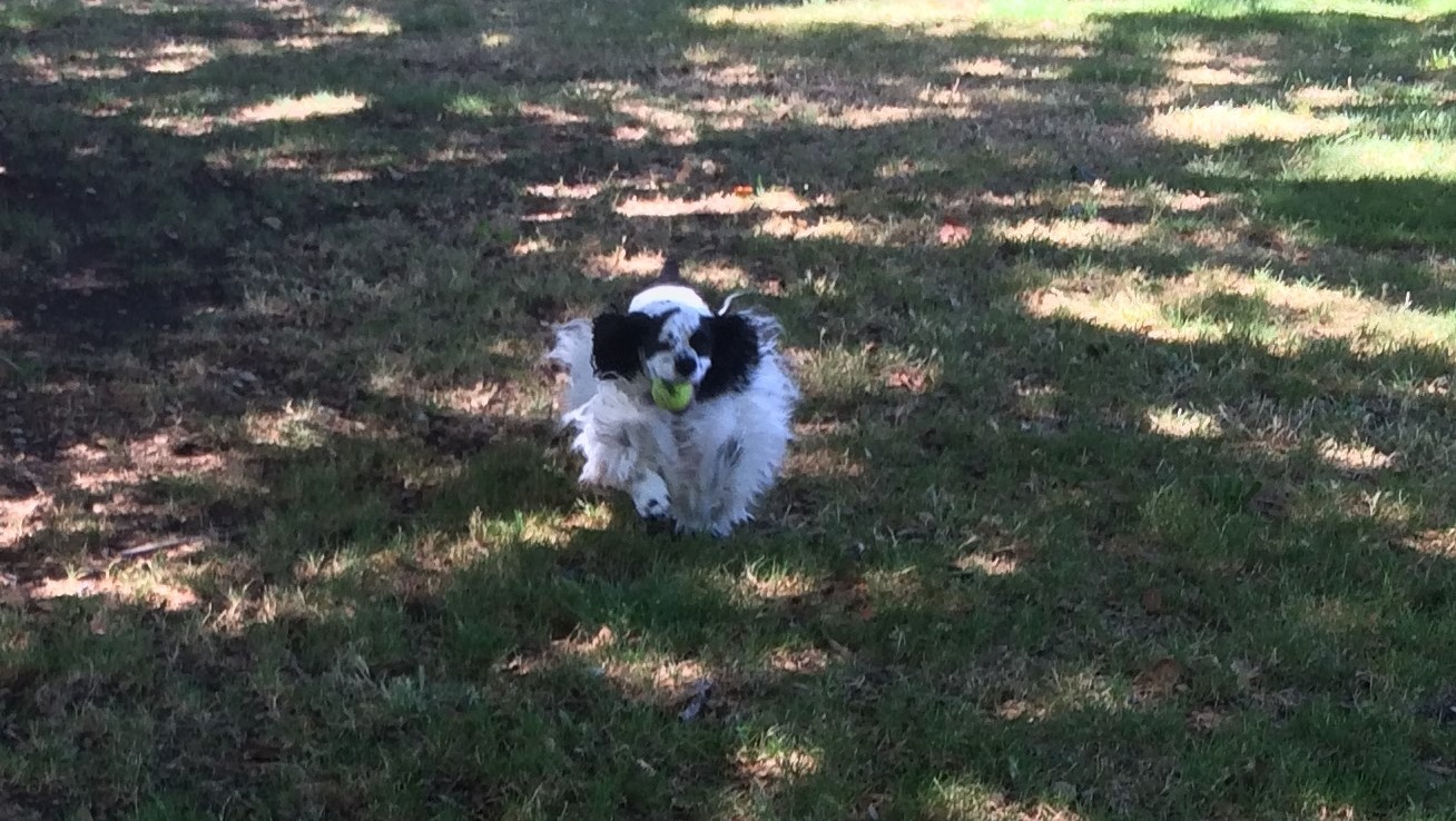 Pepper playing fetch. His absolute favorite thing to do in life! He is ball-obsessed!