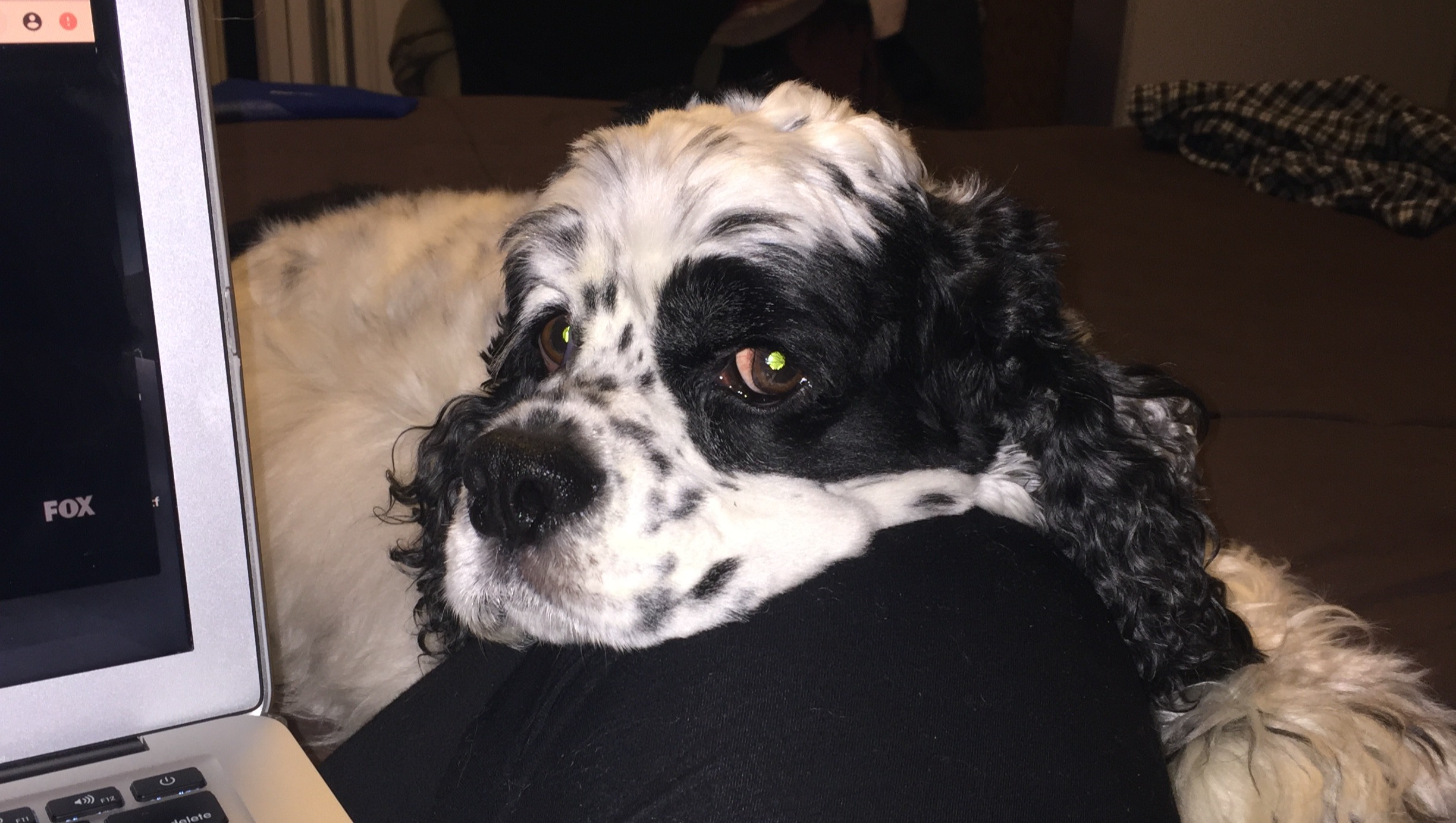 I am just going to stay right here until you are done, and give me a little love. He is the king of placing his chin on your knee and asking for what he wants.
