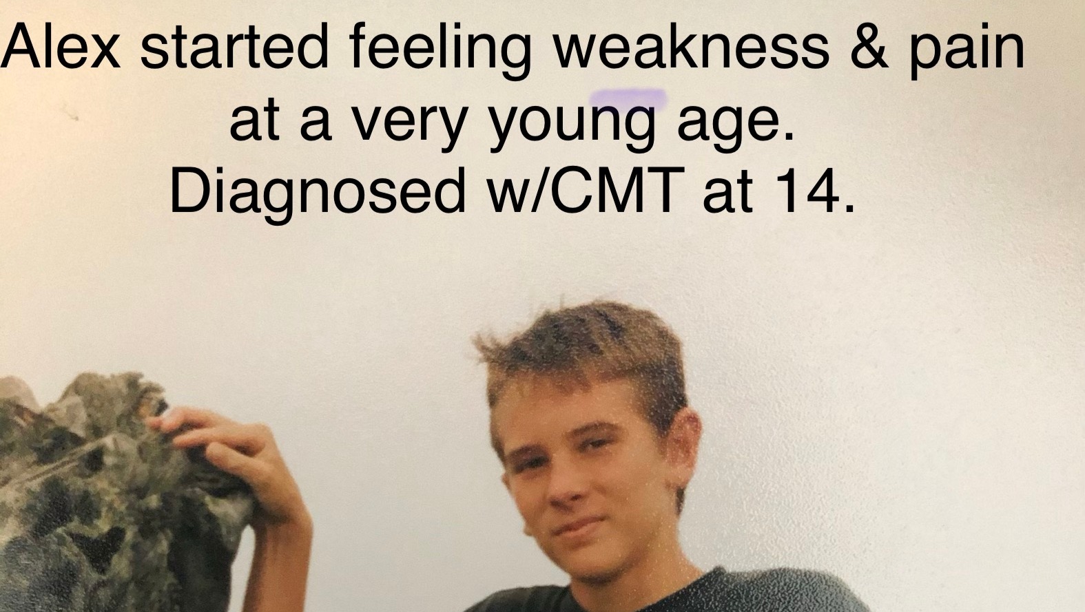 CMT is a progressive neurological disease that effects the bodies extremities. It causes degenerative nerve damage and muscle deterioration in the legs, feet and hands. CMT causes a slow deformation of the feet and hands, which is very painful. Alex has had over 20 fractures and sprained ankles and is quickly losing his ability to walk.