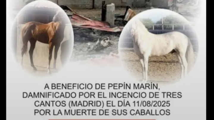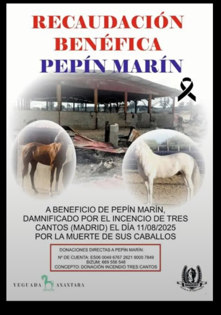 Hola soy Pepin Marín una persona vinculada al mundo del caballo toda mi vida, el pasado 11 de agosto en el incendio de tres cantos perdí mis caballos, los de amigos y clientes que montaba, mi camion, mi coche, mis monturas, cabezadas, bocados...un sinfín de arreos....
