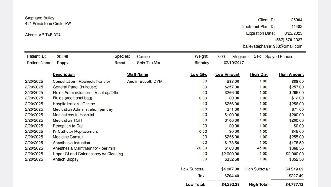 I'm Stephanie, the devoted pet mom of my precious and irreplaceable 8-year old dog Poppy, who, for the past 2 years has been experiencing recurring symptoms of a chronic gastrointestinal disease. The symptoms typically include vomiting, diarrhea, and stomach pain. Usually we bring her to the vet and it's resolved with meds but despite thousands of dollars in vet visits and treatment this time around, her condition has worsened. Our vet referred us to a specialist (Trinity Hills Animal Hospital) who did ultrasounds and X-rays and has now recommended an emergency endoscopy to diagnose the issue, which may be cancer or inflammatory bowel disease. The procedure costs between $4300 and $4777.12 (I have attached a copy of the hospital paperwork below), and I'm reaching out for donations as I've exhausted my savings and credit cards while on Long Term Disability from work. As mentioned, I have uploaded a picture below to show you the estimate from the veterinary hospital so that you know your money is being spent on saving my beloved dogs life.