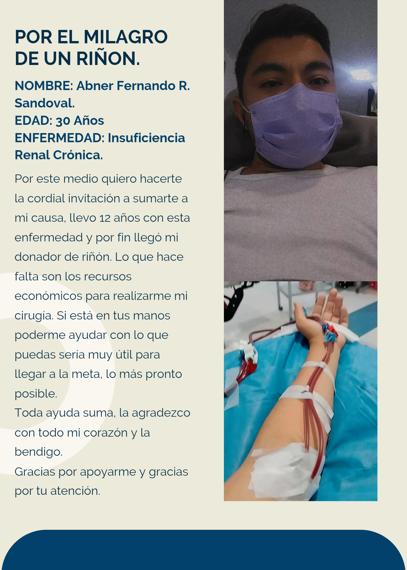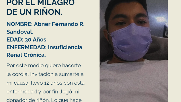 Hola mi nombre es Abner Fernando Ruiz Sandoval tengo 30 años y llevo 12 años con INSUFICIENCIA RENAL CRONICA, desde que esta noticia llego a mi vida, no eh dejado de buscar la manera de generar ingresos y tratar de ser la menor carga posible para mi familia. Actualmente por los años con esta enfermedad desafortunadamente eh perdido algo de movilidad por lo que me ha limitado hacer mi vida como antes lo hacia.