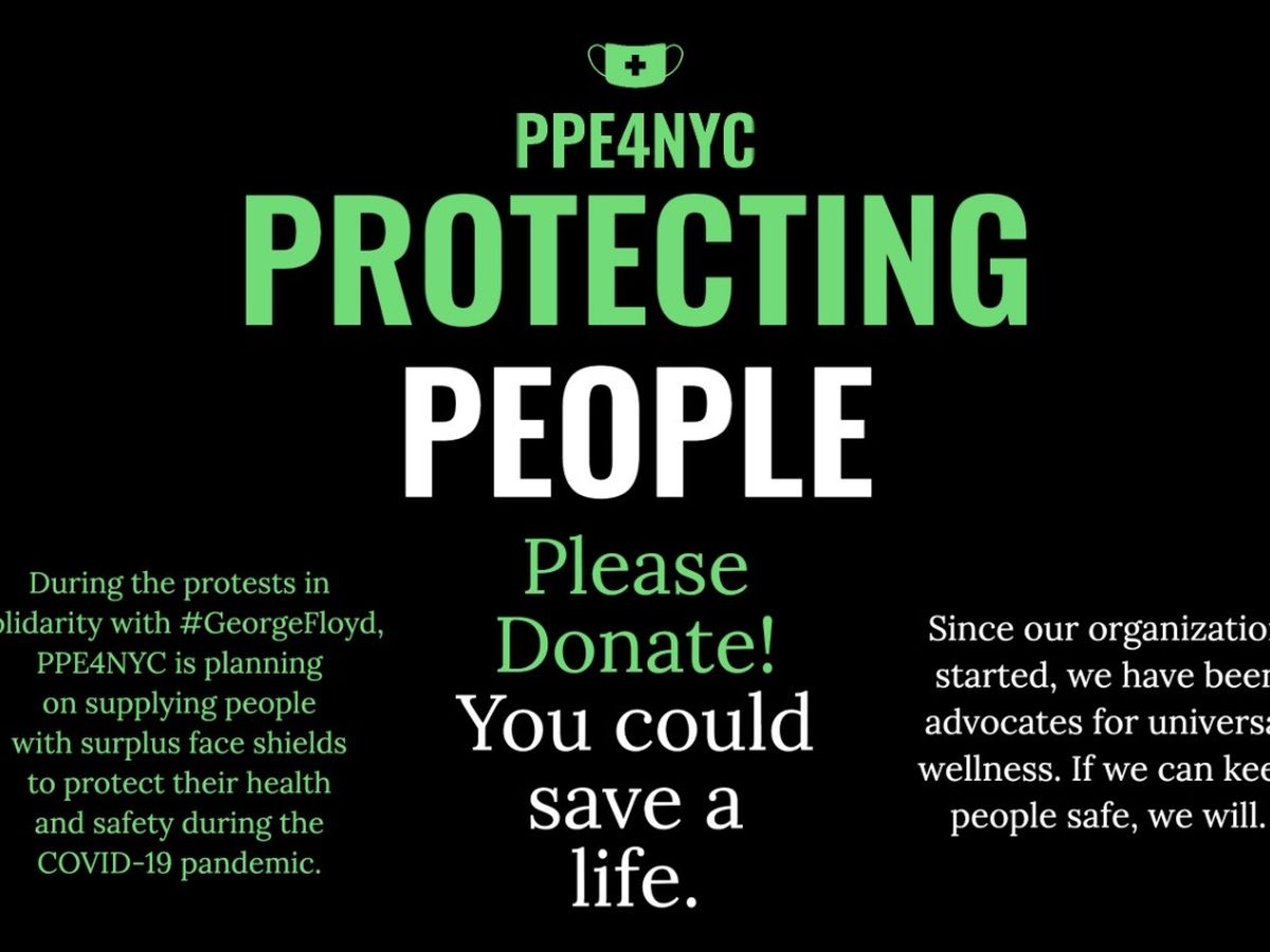 PPE4NYC aims to provide face shields to those that are protesting across New York City in order to reduce the spread of COVID-19. PPE4NYC has been providing PPE for health care and essential workers since March, and seeks to continue keeping New York safe. Each faceshield only costs $1.50 to assemble, sterilize, and distribute, so every dollar donated will help reduce the spread of COVID-19.
