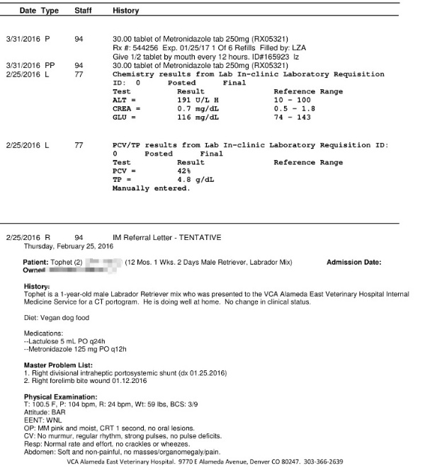 Tophet is a one-year old male Labrador Retriever mix puppy found running on the freeway near Deer Trail, CO. After unsuccessfully attempting to find his people for a couple of weeks, I decided to make him a permanent member of my family. One morning, I woke up to find his nose bleeding profusely. I rushed him to a 24-hour emergency vet and learned that he has a very large liver shunt. The cause of his nosebleed was never determined, but an ultrasound and CT showed definitively that he has what's called an intrahepatic protist steric shunt; a congenital defect resulting in a vessel that runs through his liver, preventing blood from being detoxified before being sent throughout his body. At this this time, there are no veterinarians in the area who specialize in the procedure required to seal the shunt. However, a skilled MD is willing to work with Tophet's veterinarian to perform a series of two surgeries to place a stent in his liver to close the shunt. Without the surgery, Tophet runs a high risk of developing neurologic symptoms as a result of the unfiltered blood being sent to his brain. His kidneys and bladder are already working overtime trying to maintain stasis. These surgeries will save my puppy's life. His first start seems to have been a rough one, as he was very underweight and fearful when I began fostering him. I'm still working through all of his behavioral issues, and am hoping that getting his vast medical problems taken care of will aid in this process.