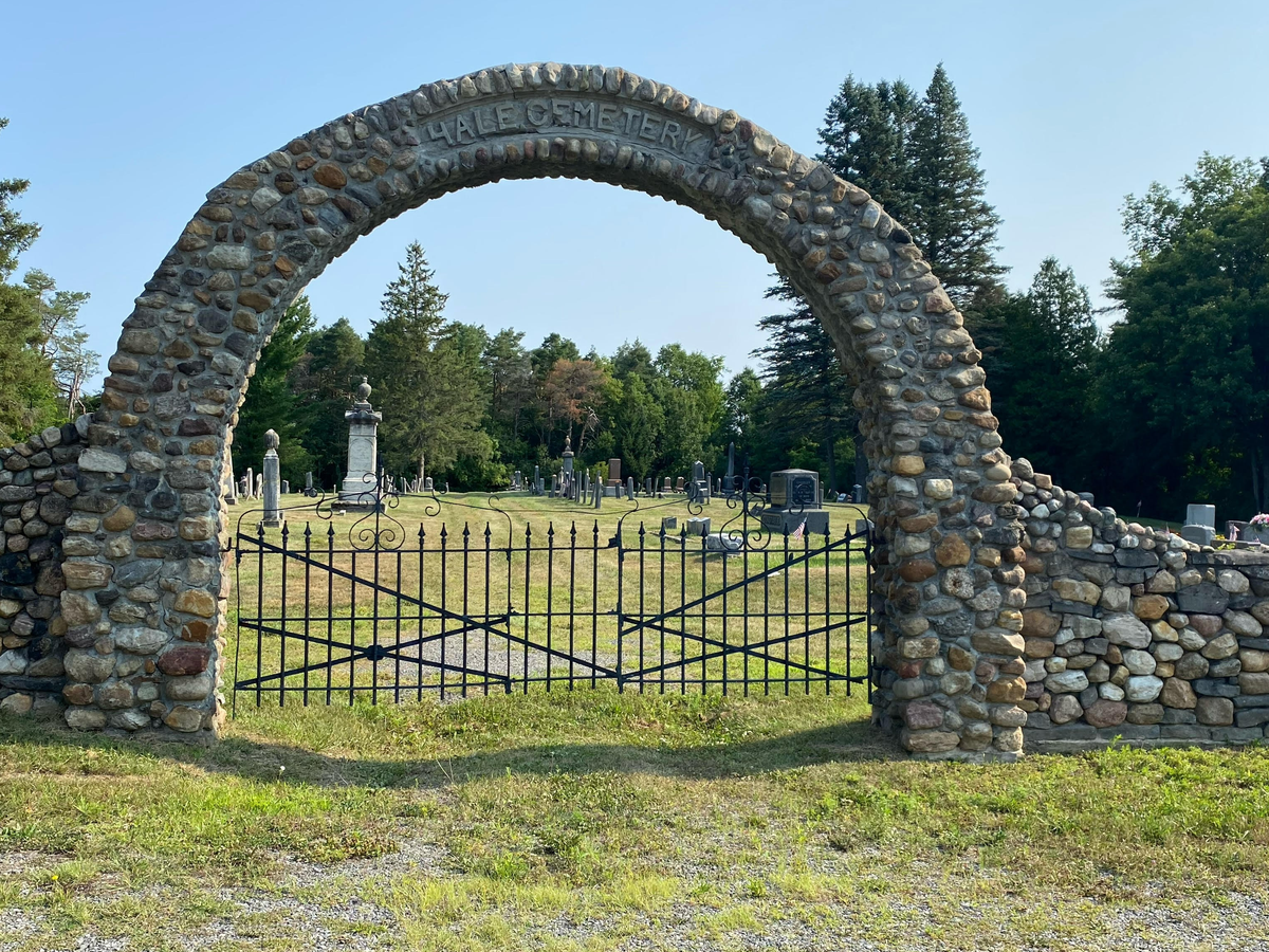 Architecturally, the cemetery is characterized by a distinctive low cobblestone wall and a cobblestone arch inscribed with "Hale Cemetery," which separates the front and older sections. These features were constructed in 1923 by William Fletcher and local mason George Dove.