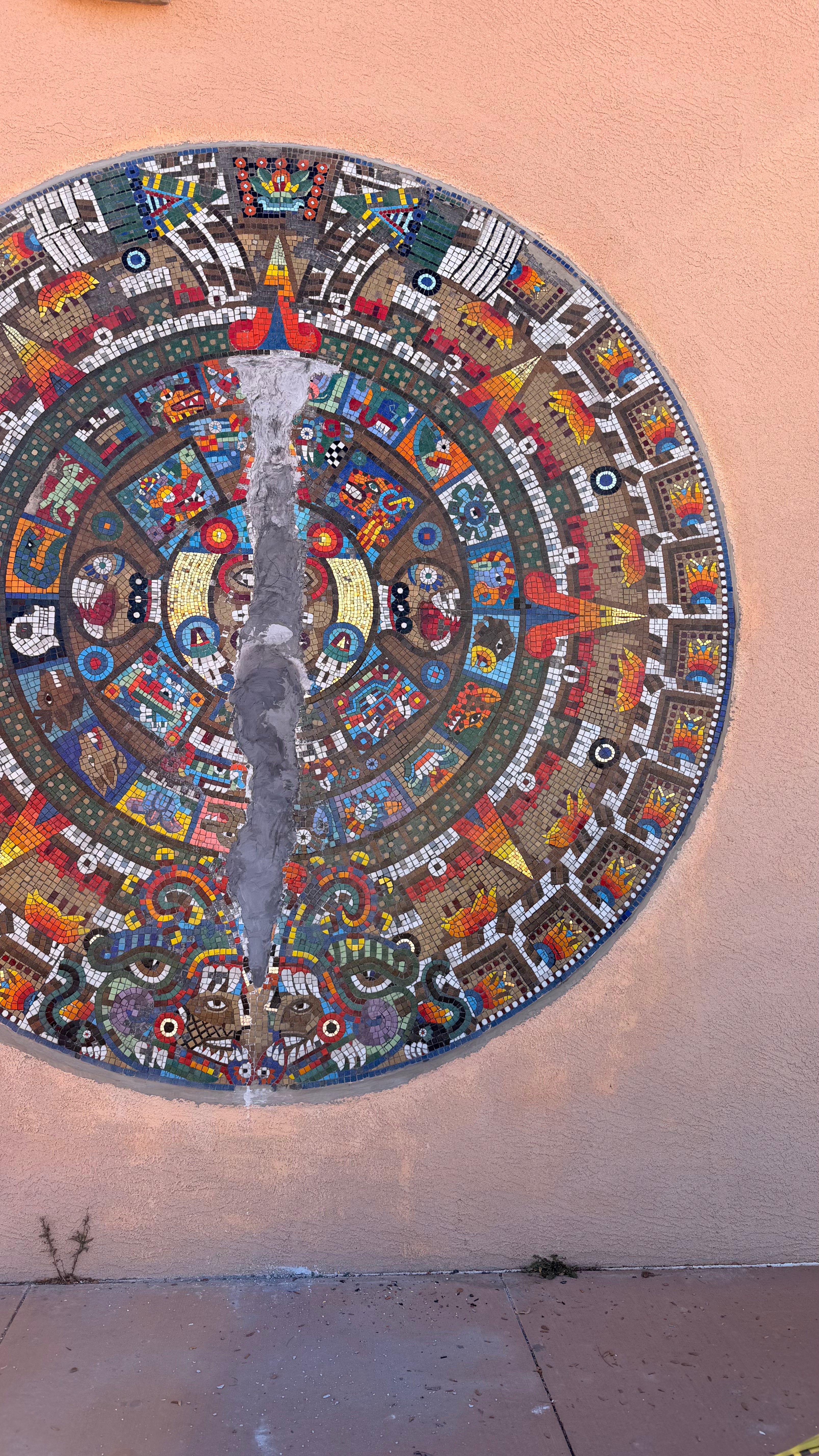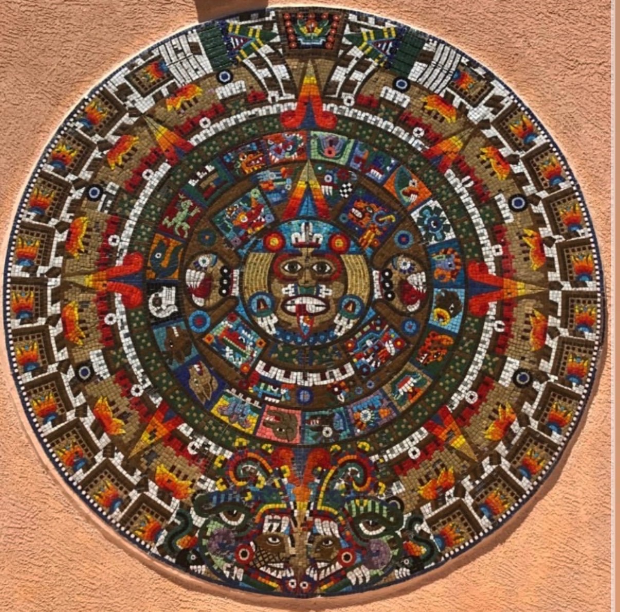 Twenty years ago, Sam Leyba, a 75-year-old, native Santa Fe artist, created a breathtaking 12-foot glass mosaic of the Aztec calendar at Santa Fe’s Community College (facing South on the art department building).