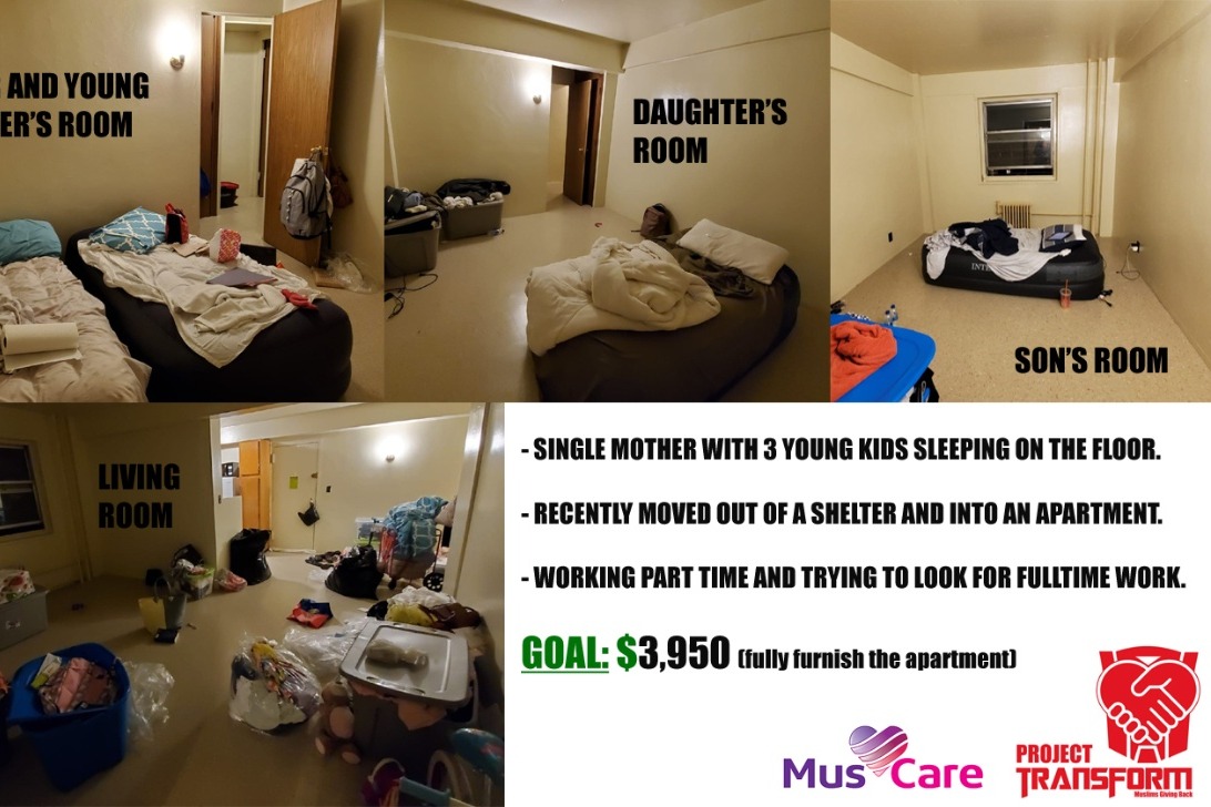 We were notified that there is a Muslim single mother with 3 young children who recently moved out of a shelter and into an apartment but is currently sleeping on the floor. She is working part time and has barely enough funds to pay bills and cannot afford furniture, mattresses and basic household items.