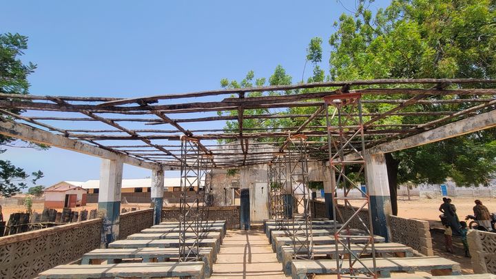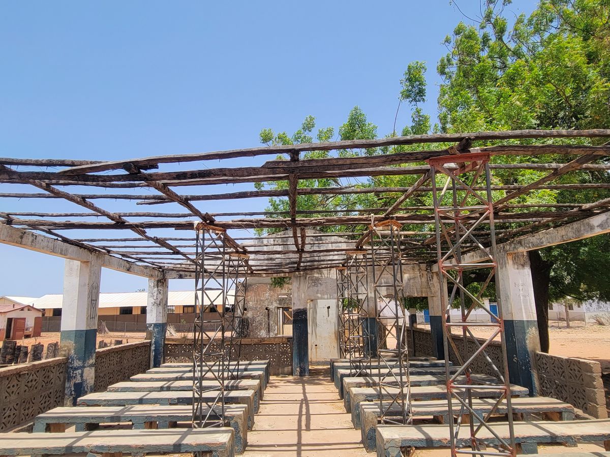 consists of a few walls with a concrete pad and no roof. In addition, there are benches outside the clinic