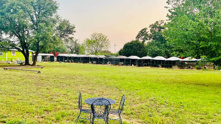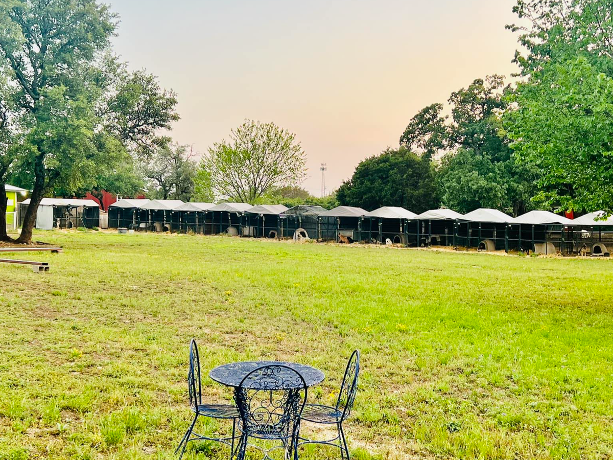 - A L shaped building that is an indoor/outdoor access for the dogs