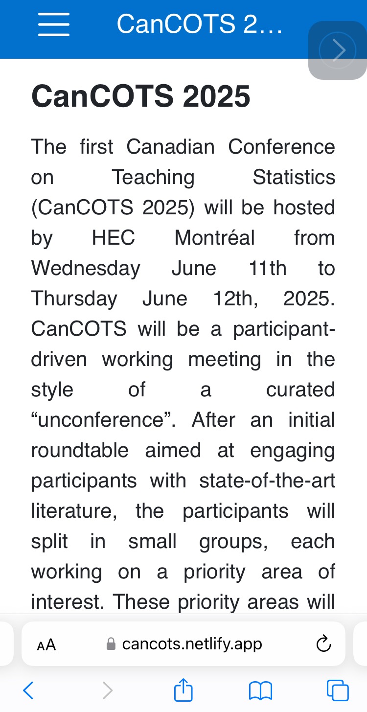 In the meantime, the conference is on June 9th to 12th, 2025, as I plan to join the CEGEP satellite workshop working group. More information about the conference can be found here: https://cancots.netlify.app/en/
