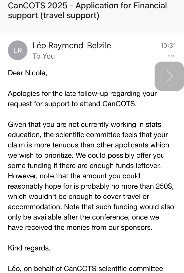 My name is Nicole. I am on the Autism Spectrum, 38 years old, and am currently not working a regular job. I am on Persons With Disabilities (Disability Assistance) in BC, Canada, where I only receive $1090.50 to last me 4-5 weeks. Having received the cheque on May 21, 2025, the next cheque will be issued on June 25, 2025. I applied for funding (travel support), and the application was rejected. There are several unaddressed, systemic barriers to working in Statistical Education in the province of BC, where I am. I am reaching out to friends and family and anyone else. There is absolutely no funding from the BC government for Autism “treatment” or (financial) support for #ActuallyAutistic adults over 20 years old in BC, Canada!