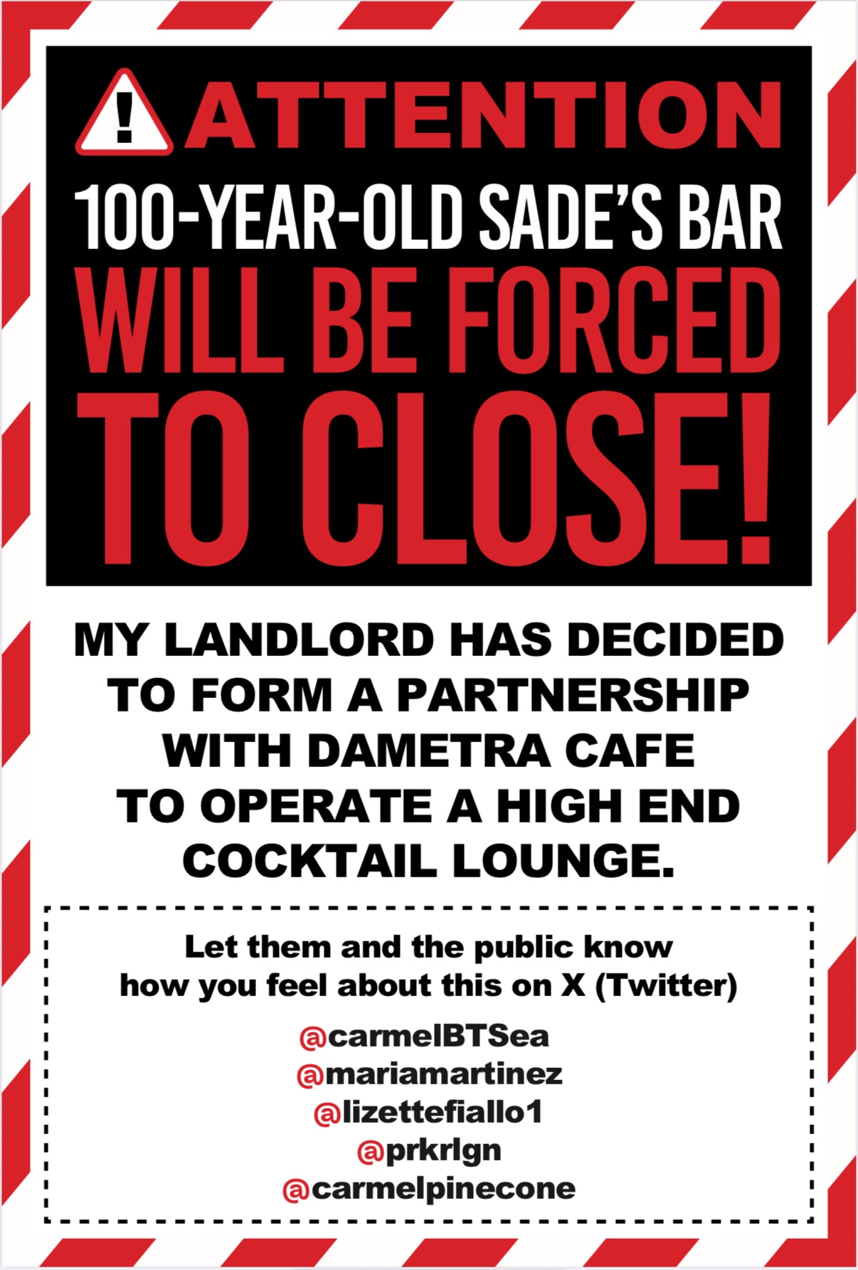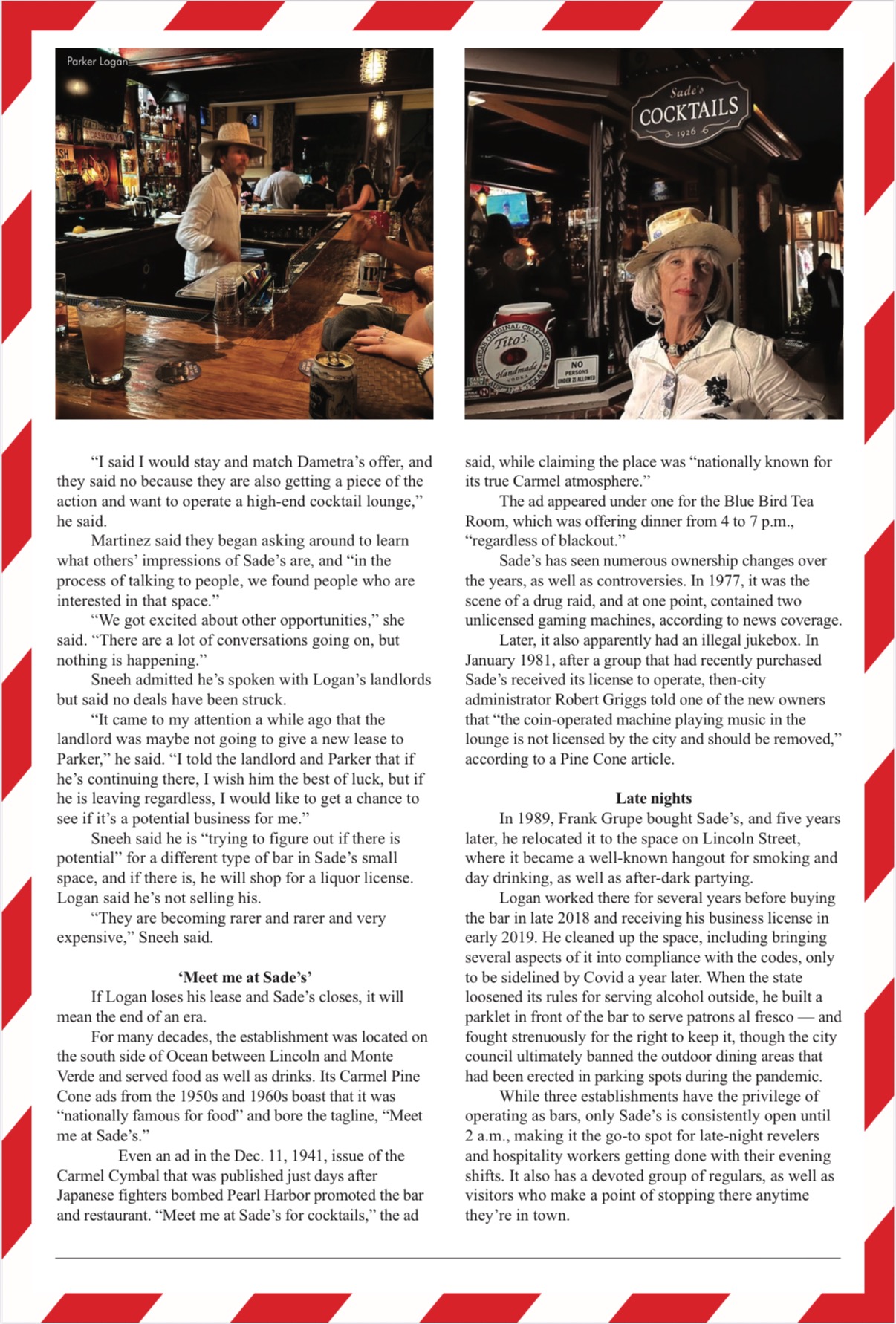 I'm the operator of Sades Cocktails since 1926, the oldest and only true dive bar in Carmel-by-the-Sea. After 10 years working behind the bar, I had the opportunity to purchase it . Now the owner for 7 years and I am still behind the bar!! I’ve poured everything into it— only to watch the new wealthy landlords lie in wait for my lease to run out and force me to close.