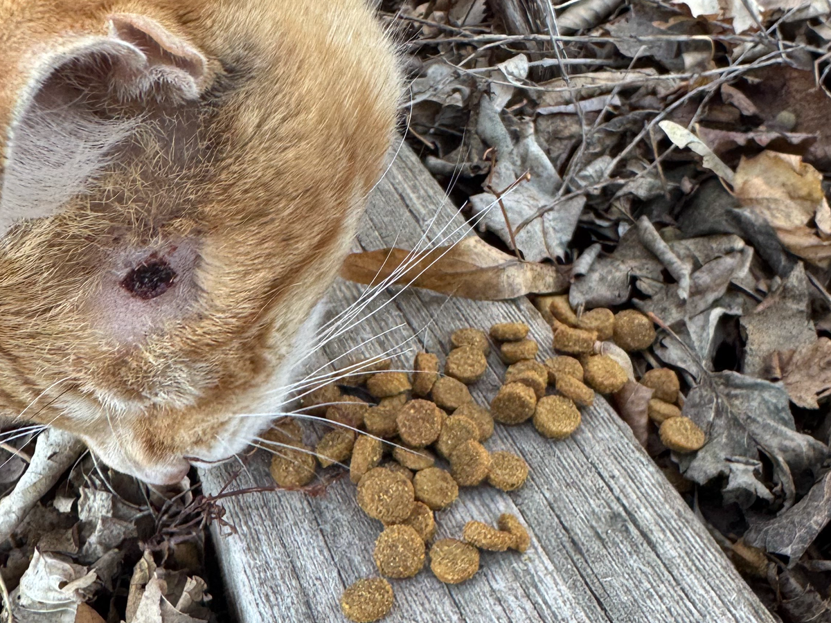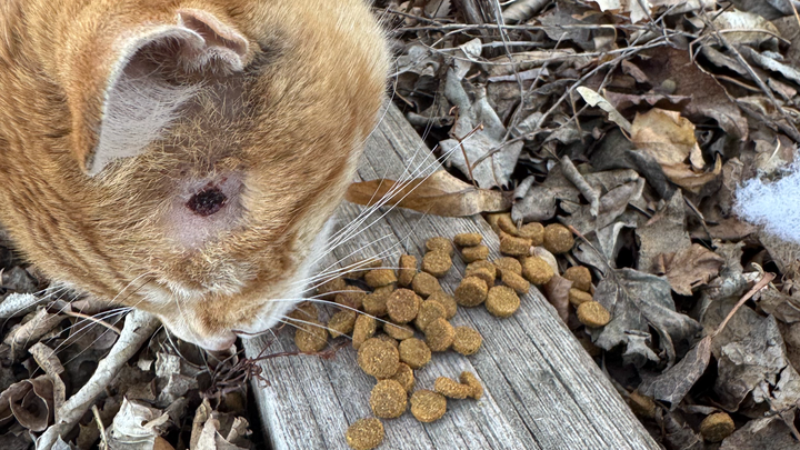 On a walk through my neighbourhood last Saturday, I noticed a stray cat with a wound above his eye. I took photos and shared them with my neighbours, who posted them to local lost and found cat groups, but nobody has claimed him as theirs. He has a crooked tail, which appears to have broken and healed some time ago, and one of his ears is broken off and black around the break. For the last few days, I've been distracting him with food and applying wound care to his head, but today, I noticed he has another identical wound, this time above his right front leg. We suspect someone may have been shooting him with a BB gun, though the wounds could be from something else.