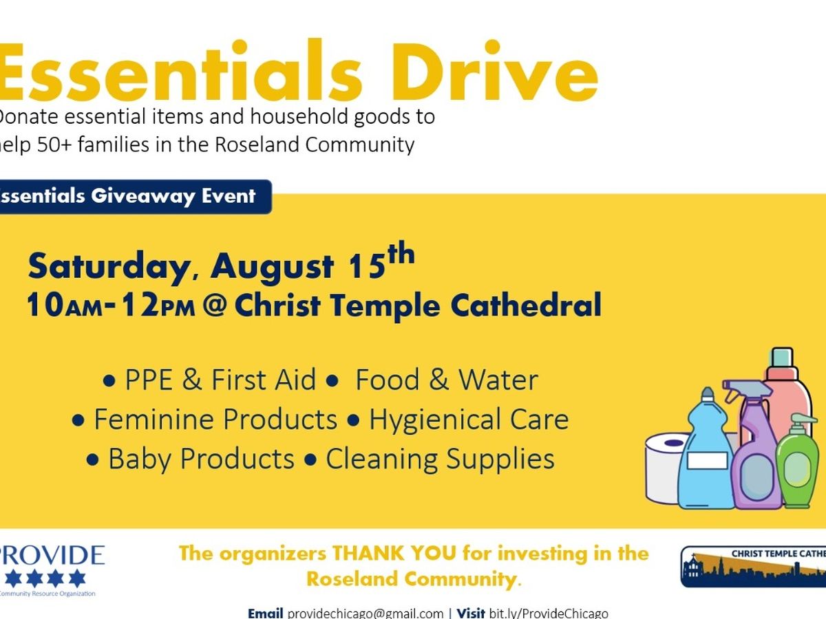 On Saturday, August 15th, 2020 from 10:00 AM-12:00 PM we will host our very first community resource drive partnered with Christ Temple Cathedral in Roseland, Chicago, IL. Our goal is to provide food, water, hygienic toiletries, feminine products, cleaning supplies, and PPE/first-aid to protect the livelihood of citizens in our communities. We selected Roseland because it is a neighborhood that is often forgotten about due to its geographical positioning in the City of Chicago. This organization sets out to bridge the gap between resources that have been provided to other Chicago neighborhoods and has left Roseland excluded. We are raising funds and accepting donations to supply 50 families in Roseland with these items. With your support of this community resource drive, we can better Chicago communities, one person at a time. Any support is welcome and appreciated, thank you on behalf of Provide Chicago.