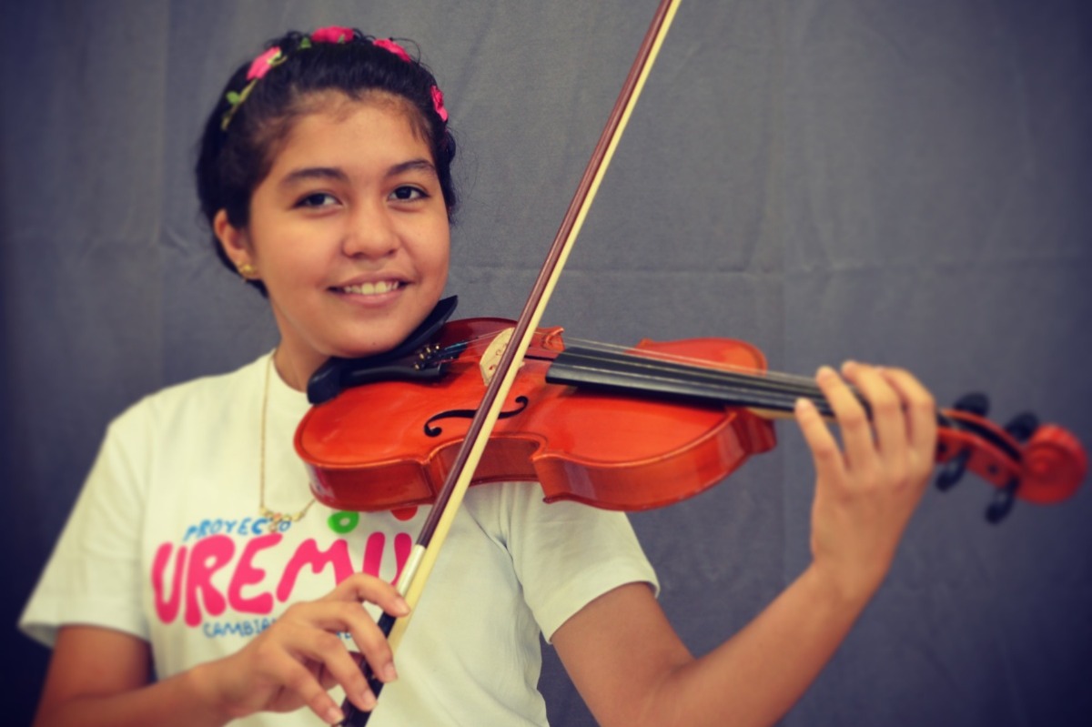 My name is Alisson Leiva and I am in ninth grade at the Jose Trinidad Reyes Public Middle School. I have two brothers Edgardo and Ángel who are also students of Proyecto Uremu. I live in San Pedro Sula, Honduras, in Colonia Satelite where my music class is located. Thanks to Proyecto Uremu, I've had the opportunity to discover that I have musical talent, and I like that our teacher Marcela has patience, gives us love, and teaches us many things, it's not just learning how to play the instrument. During my free time, I like to listen to music and to play my violin. I love eating chicken with fried plantains and I love to play soccer. I would love to travel to Korea because it is a way to make Honduras and Proyecto Uremu proud. I want to improve my musical technique and I would love to know not only Korea but many other countries doing what I love which is playing my violin.