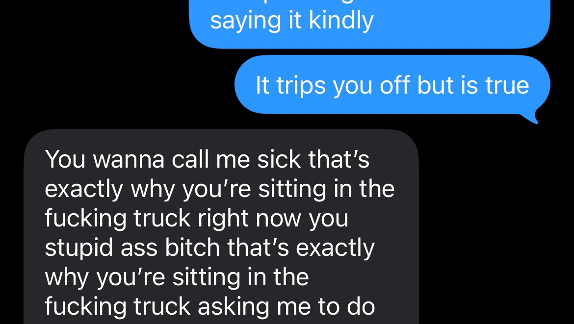 Finally stopped fueling the car we have been living in for 6 months, got me stranded in her backyard unable to go anywhere, I wasn’t allowed to go inside the house she was staying with her friend. I finally said enough when she said I had to lick her filthy butthole and apologize if I wanted food. My dignity has never been crushed like this. I didn’t do it..