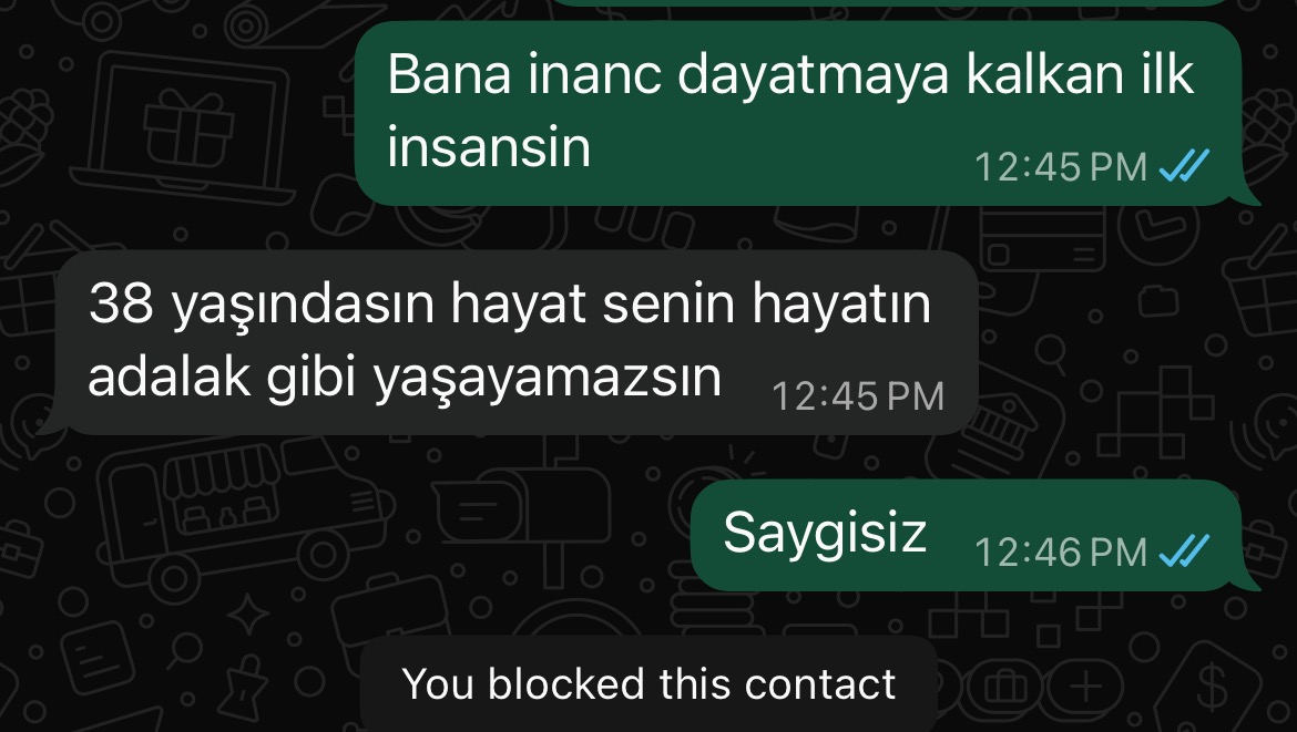 I called my mother and asked her forgiveness, describing the situation I was in and asking for help. She sent me 80 bucks (she is rich enough to send thousands easily) and said she would support me, I went ahead and left the woman I got tangled up with. Then my mother started asking me to delete posts and tweets criticizing Islam, Ottoman Empire and Recep Tayyip Erdogan, of course.. She is asking me to go back to Turkey and become a Muslim again, or stay here all alone and hungry like a parasite.