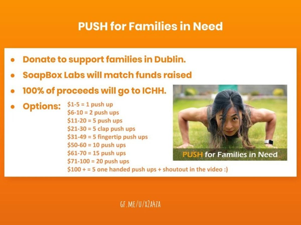 This fundraiser is called "PUSH for Families in Need" because for a limited time only, I will do push ups for YOU for the families in Dublin. Below, you'll see a menu of the different types of push ups you can make me do depending on the amount you donate. At the end of each day, I'll tally the totals and post a video of me doing the requested pushups. You will get the joy that is the reserved lot for cheerful givers, and the assurance that your money is going straight to necessities for needy families. You will also get the pleasure of watching a tiny but mighty Asian girl do push-ups on your command, although I hope you'd consider the former gain to outweigh the latter :)
