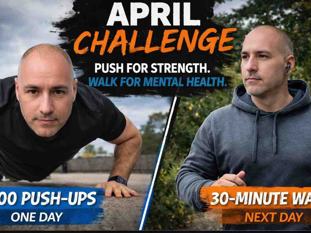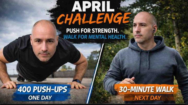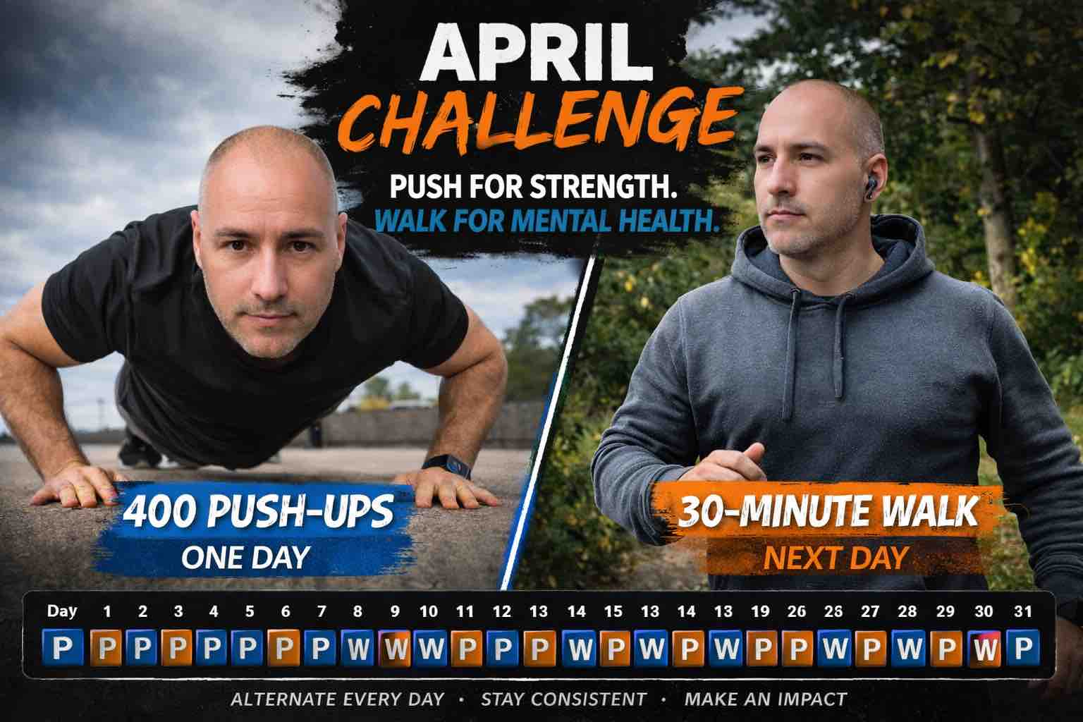 So in April, the challenge continues, but in a different way. In April I will alternate every day: One day: 400 push-ups, Next day: 30-minute fast walk, Then repeat for the entire month Push-ups represent strength and discipline.
