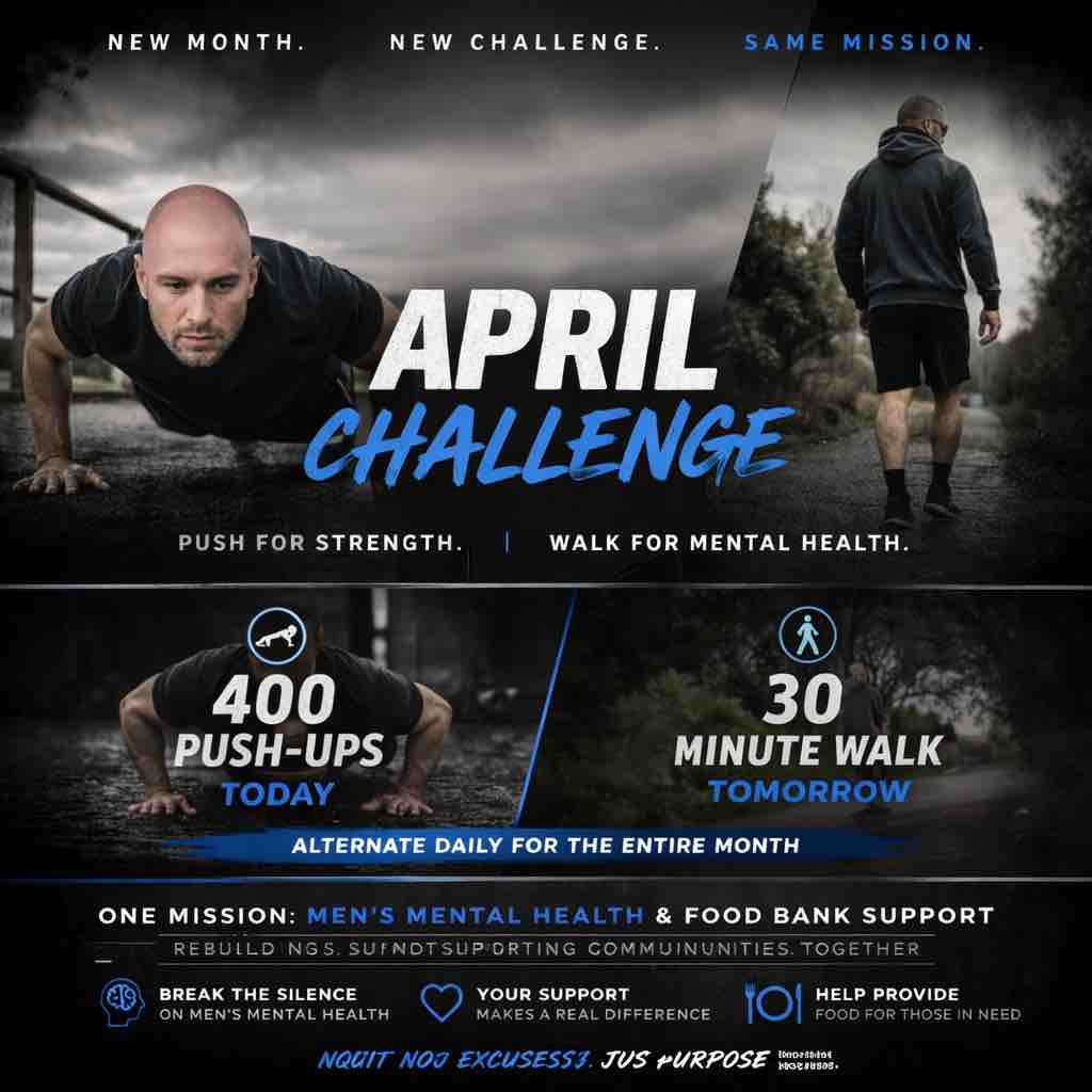 Walk for Mental Health In February and March I set myself a challenge: Do push-ups every single day and raise money for men’s mental health and food bank support.
