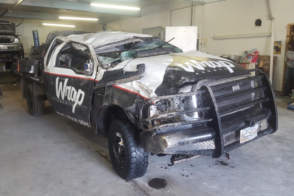 -girl at the wedding. A tremendously fun celebration, we were all feeling so joyful until black ice surreptitiously took its toll. Crossing an icy bridge between 7th and Main on Interstate 90, their pickup went out of control on the ice and eventually rolled 4 times. Luckily everyone was belted in and escaped major injury.