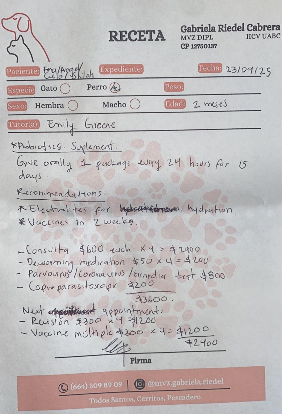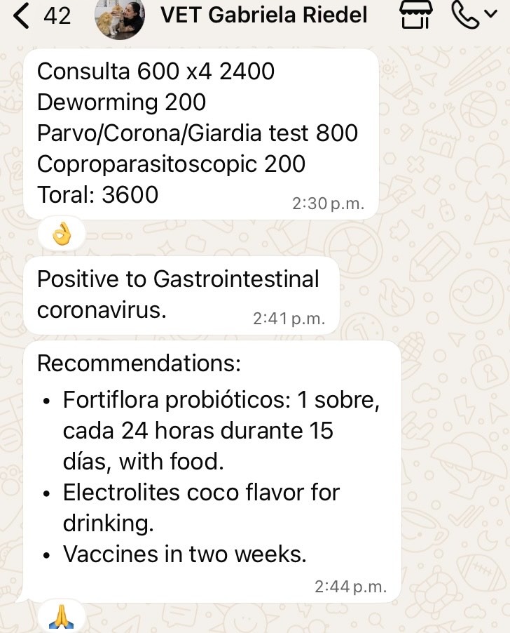 Consulta veterinaria y desparasitación: 3,600 (ya pagado)