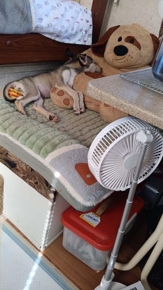 El lunes 22 de septiembre, una mujer muy amable llamada Julie respondió a mi publicación y aceptó quedarse con la perrita de apariencia husky. Hasta ese momento, yo no había tenido contacto con ninguna de ellas, ya que estaban escondidas bajo la combi y aterradas. Traté muchas veces, pero corrían de un lado a otro y no lograba atraparlas. Sin embargo, como Julie aceptó a una, me propuse atrapar a las tres y darles refugio en una perrera que construí para mis tres perros rescatados.