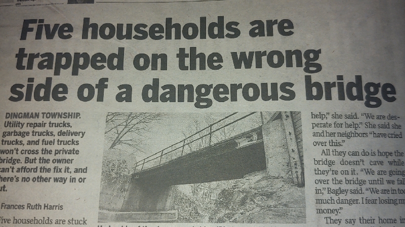 Please help! I am a 74 year old widow with a special needs grandson living in my home. I have a bridge on my property that needs repairs to make it safe. I do not have the ability to pay for these repairs. My home was remortgaged to pay medical bills for my husband's two bouts of cancer that lead to his death. Due to the remortgage I have very little equity in my home. This GoFundMe will raise the funds to repair the bridge on Wyckoff Lane in Milford, Pa. Five families use this bridge as the only means to access their homes. If we lose use of the bridge we are trapped and presently cannot get emergency services such as fire and ambulance if needed. Morgan Site contractors will do the project from required permits to construction. Their rough estimate is $150,000. None of the residents have the resources for that amount of money. We are in dire need of help.