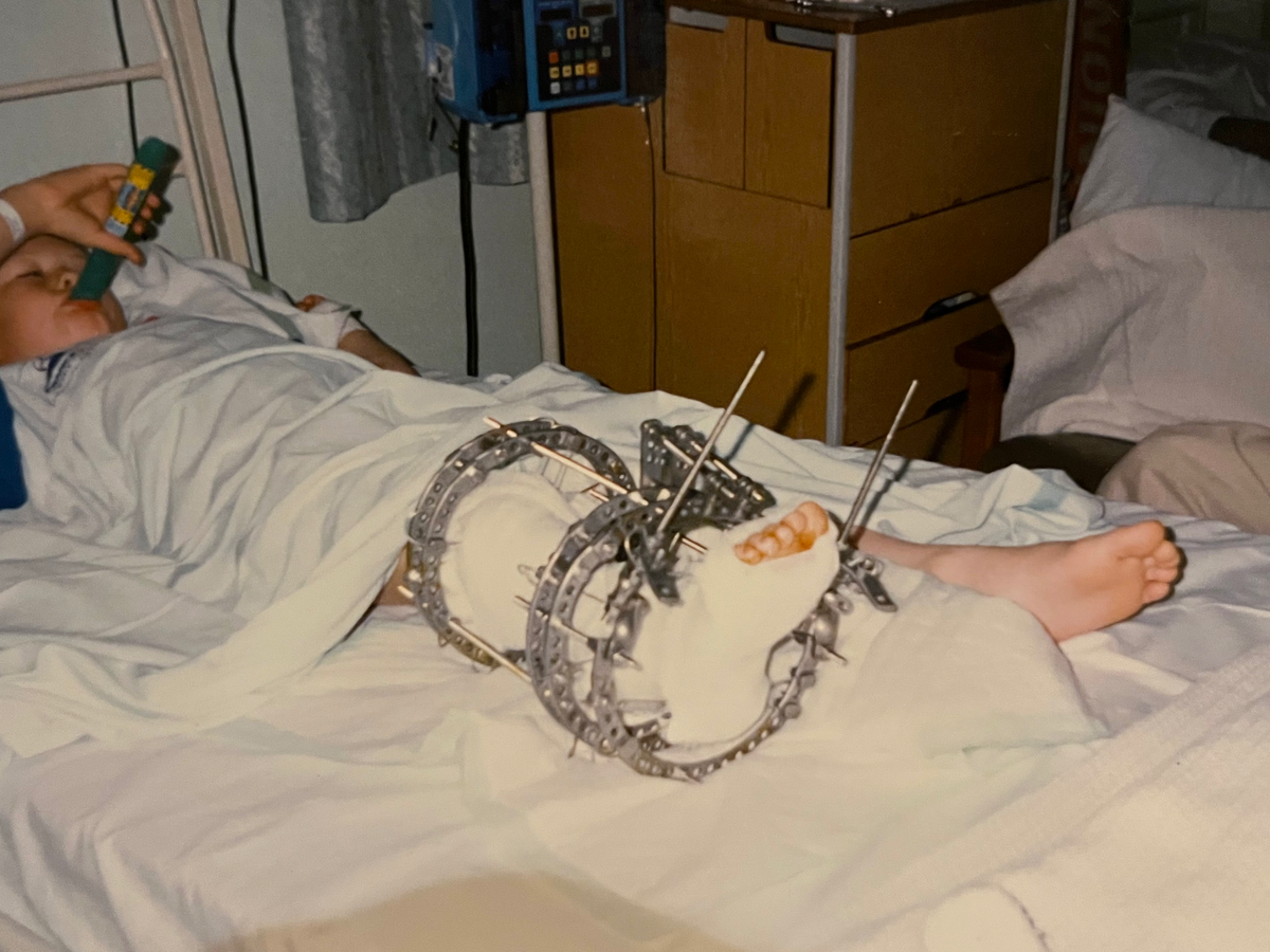 At around 9 years old, Dan had an operation. You can see in the cover picture how big it was. It was a cage with pins through all the bones in his leg, ankle and foot, which would need turned daily. The idea being that as the pins were turned, the bone would split and heal, incrementally getting longer and longer to the point his legs matched length. This was a long process and put him through the wringer. I still remember Mam cleaning the wounds to help the infections he would get, but he was typically hardy, got on with it and played loads of PlayStation!