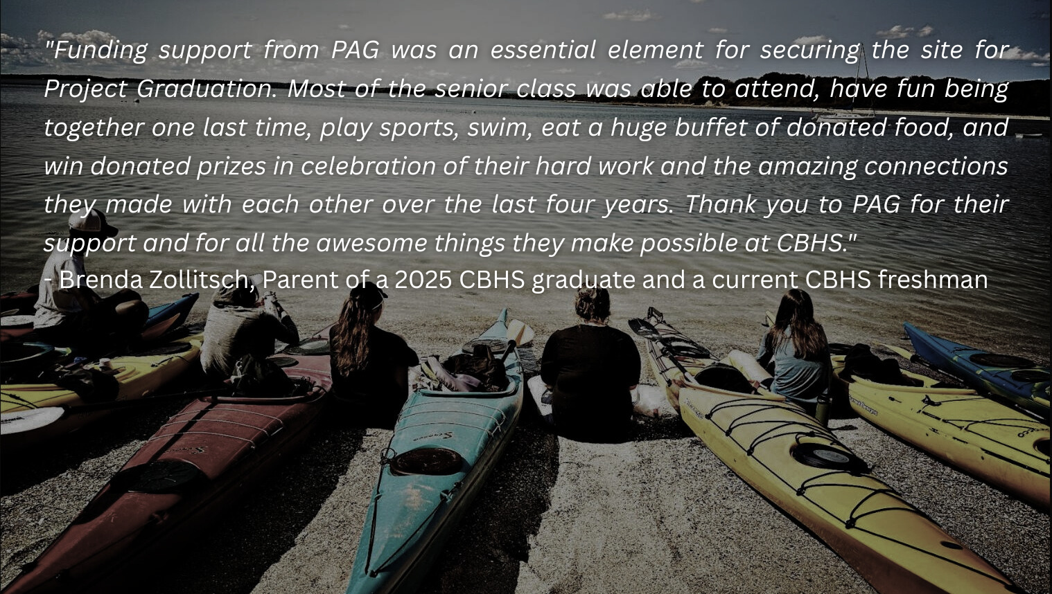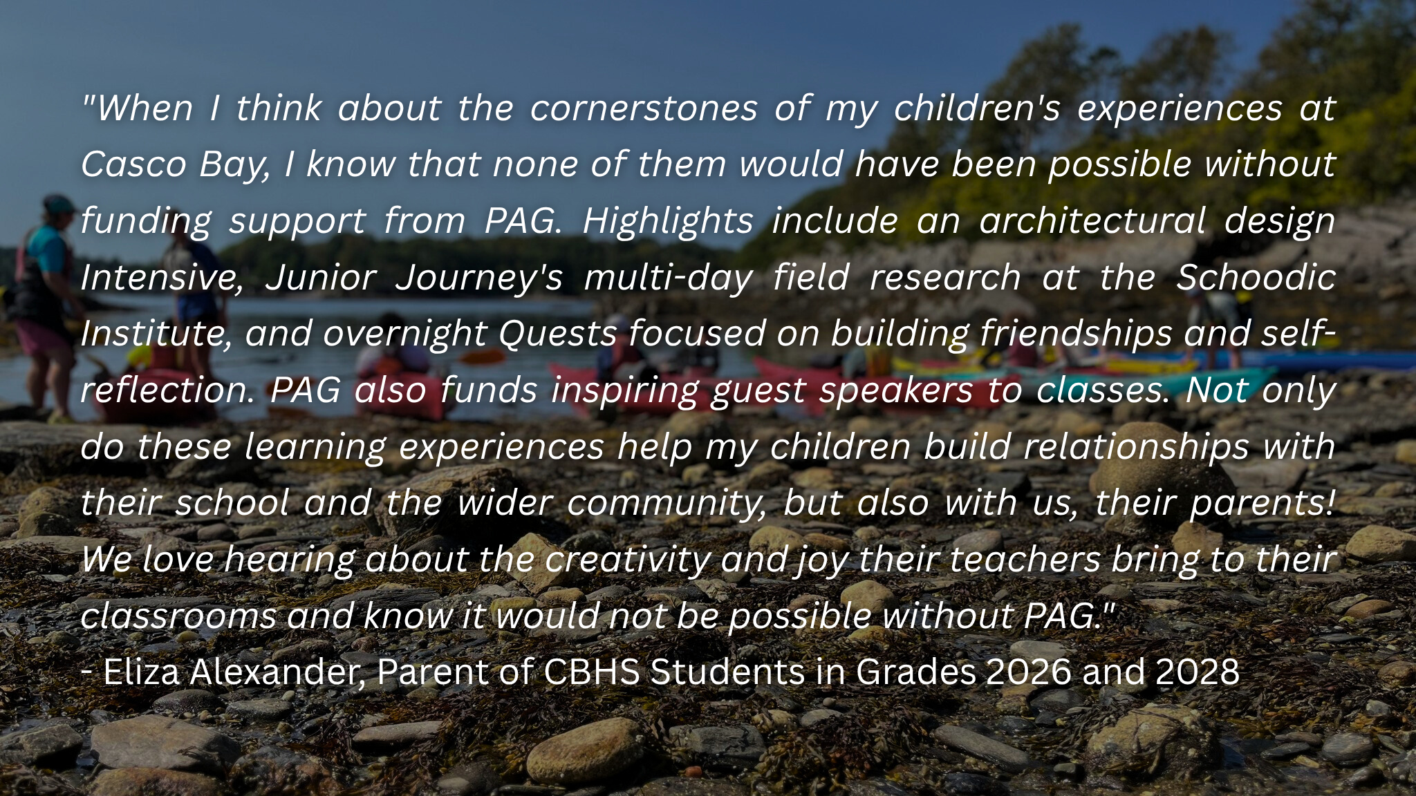 Casco Bay’s Parent Advisory Group (PAG) raises funds exclusively to support expeditionary learning and other unique opportunities that define the student experience at CBHS. The generous support of our community makes this mission possible.