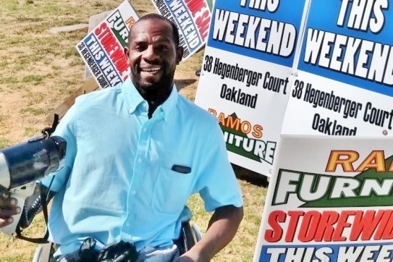 "I had never met 32 year-old Quincey Carr before this year, but I had seen him on the island of the intersection of Hegenberger and Edgewater in Oakland numerous times in his wheelchair with his local furniture signs and his bullhorn yelling at passing motorists promoting the furniture store.  One day while on a duty break, I visited the furniture store and told the store employees that I would have never visited the store if it wasn’t for the guy in the wheelchair and the bullhorn.  I was later told by store management that Quincey was their best employee. I still, at this time, knew nothing about Quincey, not even his name.  One day, timing had it that I stopped in my patrol car right at the intersection on a red light.  During that time, I called Quincey over and told him that I put in a good word for him at the furniture store. He smiled and asked me if I knew a certain Police Sergeant which I had.  He told me that this particular Sergeant had solved the case against the person who had shot him rendering him paralyzed.  I said goodbye, but I still knew nothing about Quincey.
