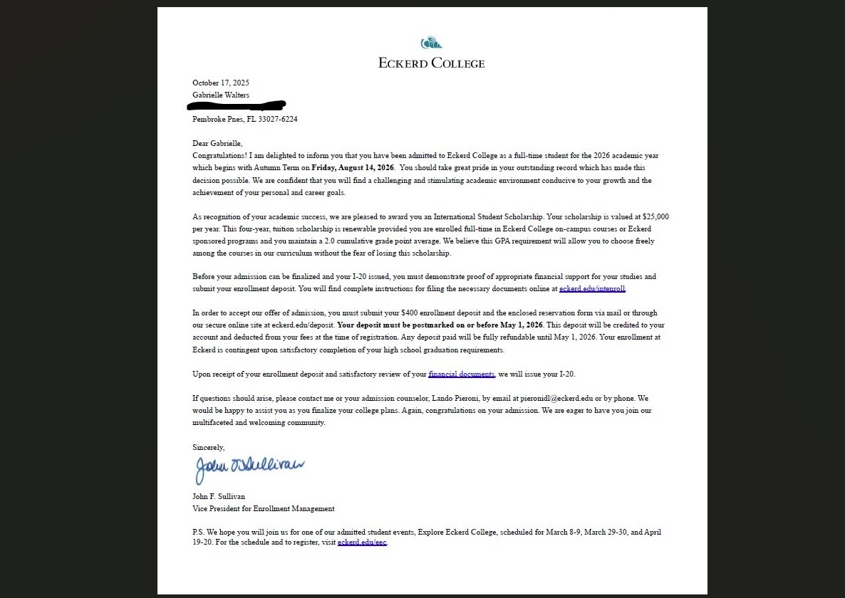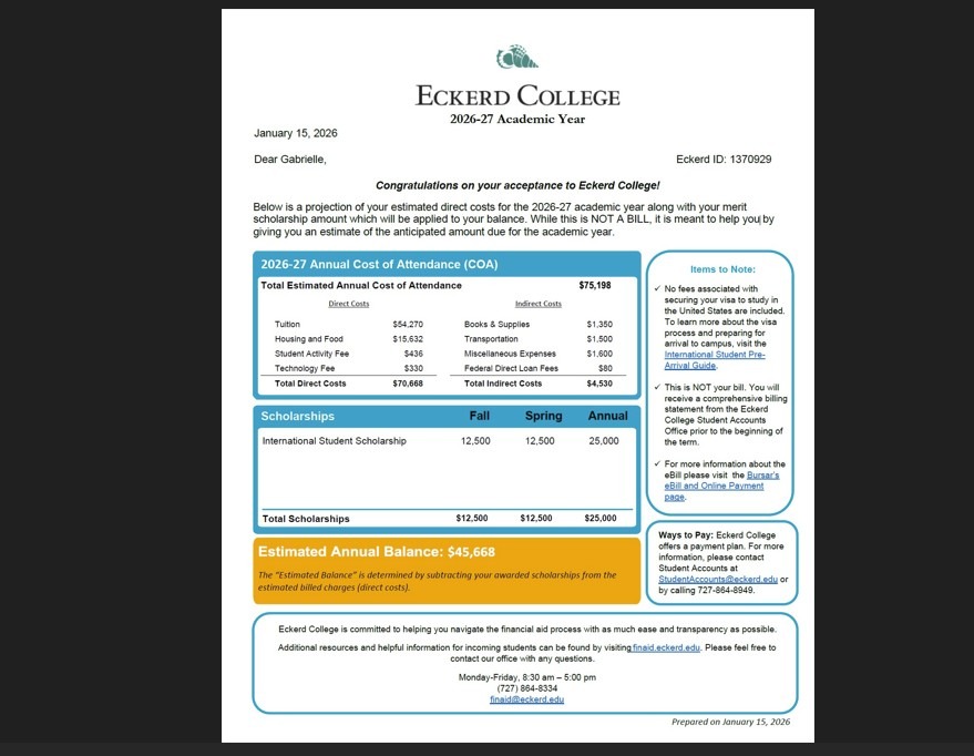 Eckerd College has offered Gabby a $25,000 scholarship to attend their science program that will prepare her for veterinary school based on her exemplary honors programs and high school GPA. However, the remaining cost of tuition, housing, visa application, and required academic expenses totals approximately $50,000 for her first year.