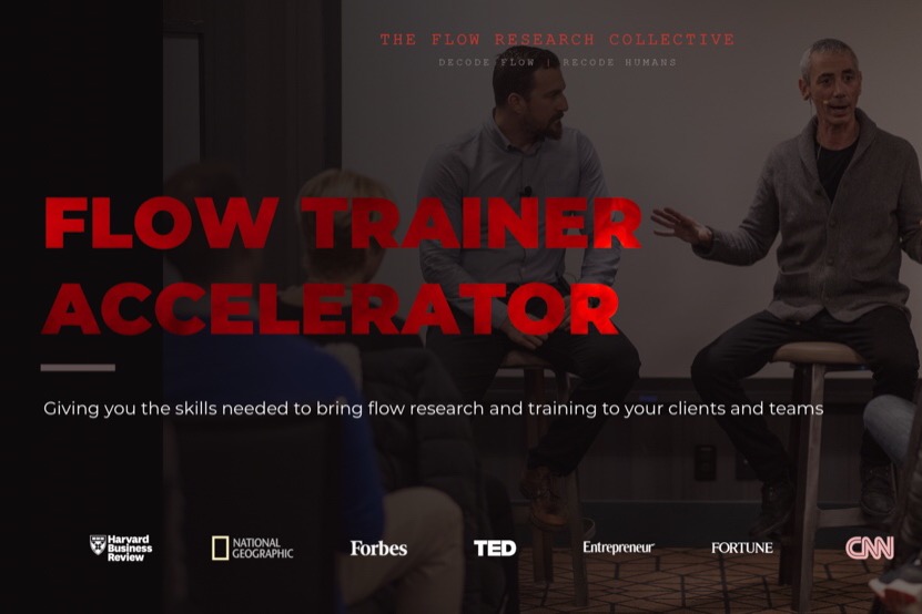 to train in their Flow Trainer Accelerator program. The Flow Research Collective is a peak performance research and training institute. On the research side, they have partnered with universities like Stanford, UCLA, USC and institutions like Deloitte, F1, RedBull athletes, Navy Seals, and Google attempting to understand what happens in the brain and body when human beings are performing at their best. On the training side, they build training programs that help improve performance by accessing flow states more consistently, leading to increased creativity, decision-making and information processing.