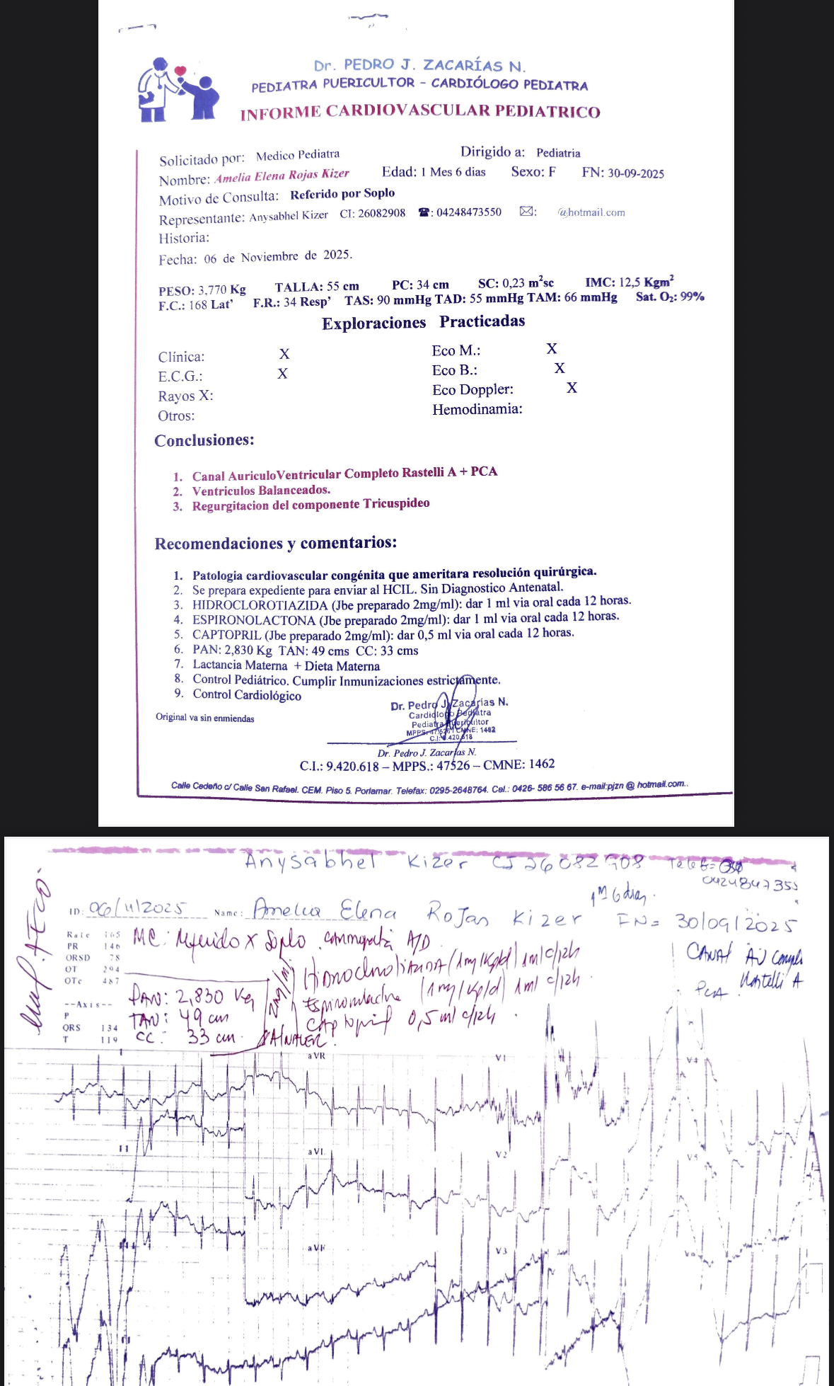 Al mes de nacida fue diagnosticada con una cardiopatía congénita compleja: Canal Auriculoventricular Completo Rastelli tipo A, además de otras malformaciones cardíacas como PCA, CIV y CIA. Estas condiciones hacen que su pequeño corazón no se haya formado correctamente y hoy tenga que trabajar el doble para mantenerla con vida.