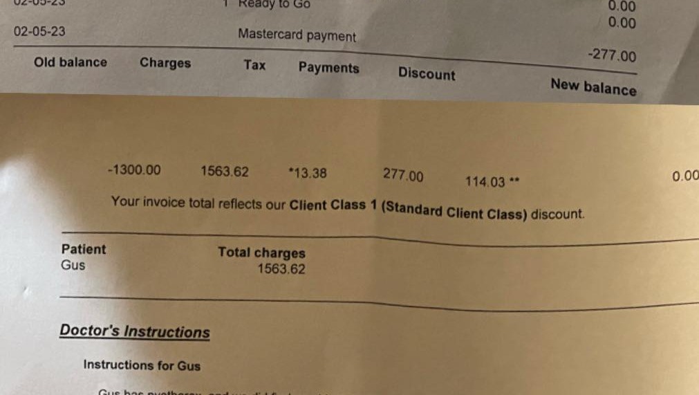 Gus is at the emergency vet for the second time in 24 hours and they're expecting to keep him for another two days, with the vet bills expected to top $6k. Gus stopped eating over the weekend and Sunday morning Gretchen knew it was time to take him in to the emergency vet. A bad morning was made worse when her car wouldn't start and she had to Uber to the emergency vet in the next town over. He was there all day, given antibiotics and they found pus in his chest. They drained his chest and sent him home. (Sunday's bill below.)