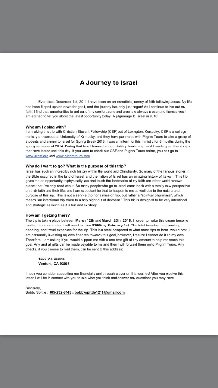 Hello! If you have found your way to this page, I am assuming you already know me and what I am fundraising for. But just in case you don't....My name is Bobby Spittle. I am 22 years old, I live in Ventura, CA, and I have the awesome opportunity to take a pilgrimage to Israel during Spring Break of 2016! I am taking this trip with CSF, a campus ministry at University of Kentucky with which I had the privilege of being an intern about two years ago. Israel has such an amazing history in our world, and getting to see, smell, and touch the historical places that we hear about so often can be a life-changing experience. I am hoping for that experience for myself and everyone on this trip!